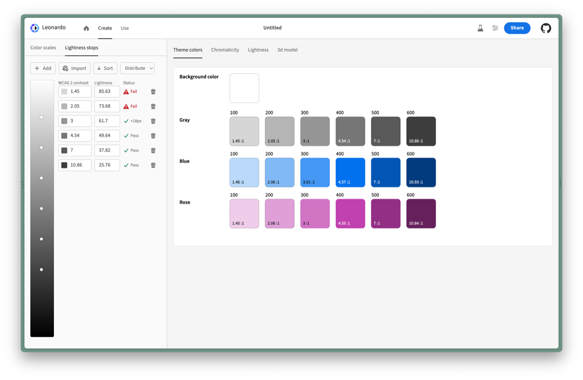 首先,有没有替代 HCT 实现基础色板感知亮度一致的工具?答案是有,Adobe 的 Leonardo,一款基于对比度生成颜色的超强工具,在 Material color utilities 开源前,笔者使用其作为替代第一次生成了统一亮度的基础色板。另外这个工具的设计师专门写了好几篇非常棒的文章布道他的理念,这些在 Leonardo 官网的 Articles 标签页中可以看到。