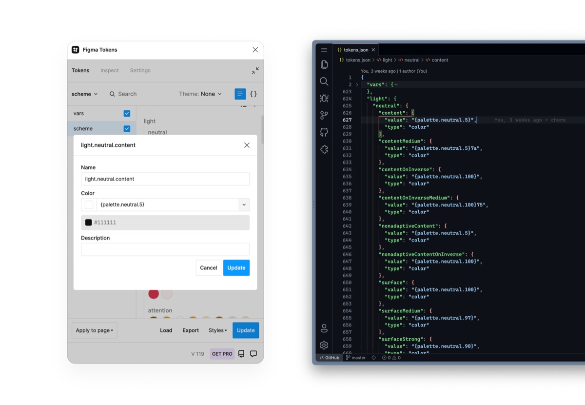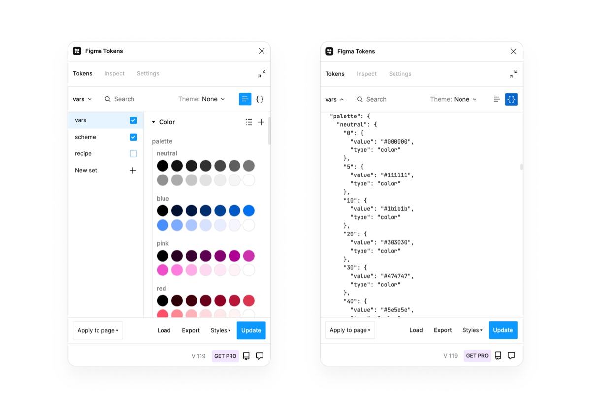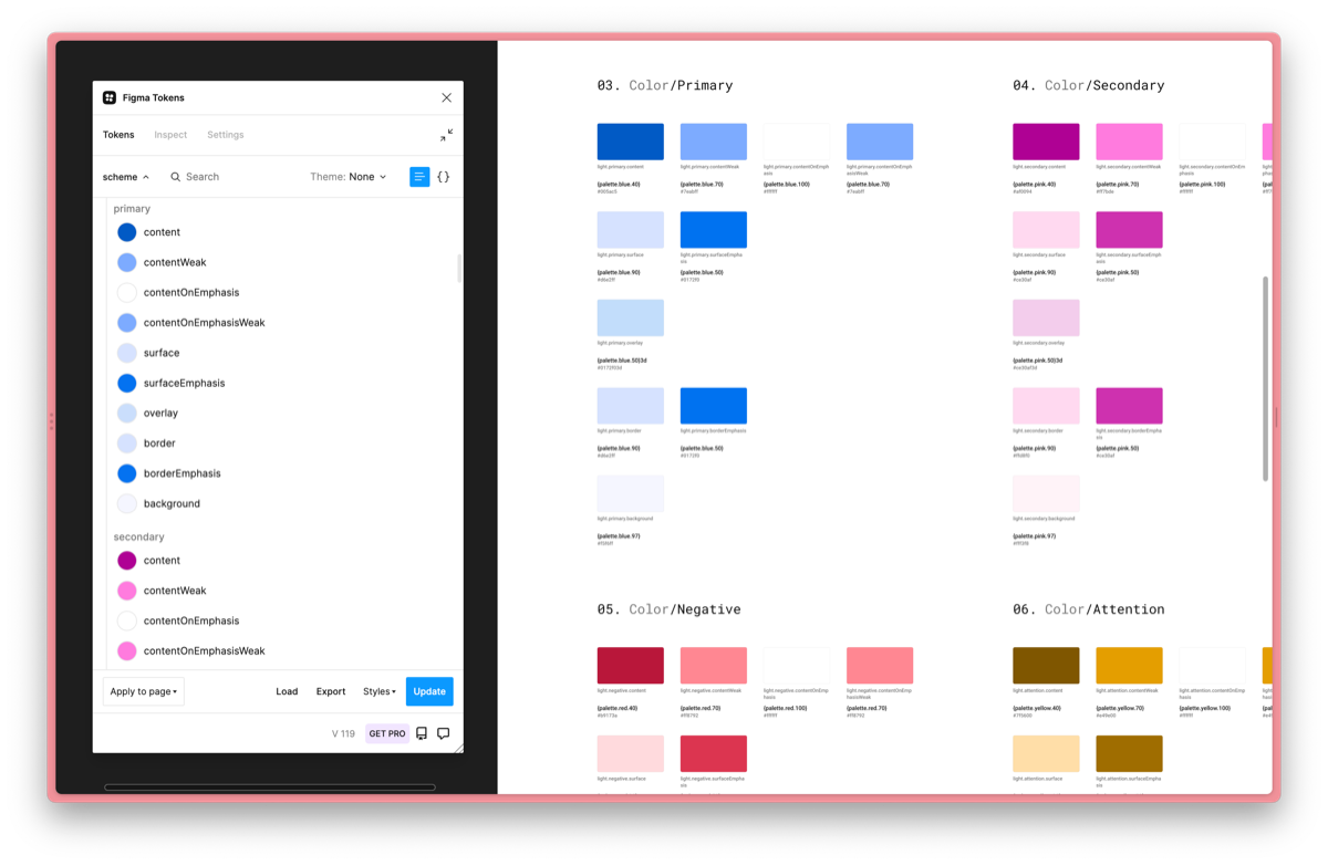 在文中笔者提到使用 Figma tokens 插件对色彩系统进行管理,因此后续所有的更新与维护均是基于该插件进行操作,修改之后只需要点击 update 就可以自动修改 Figma 中对应命名的 style。不过这个插件还是有一定的上手难度,推荐大家先看下 官方文档 与插件作者在油管上的 介绍视频 。