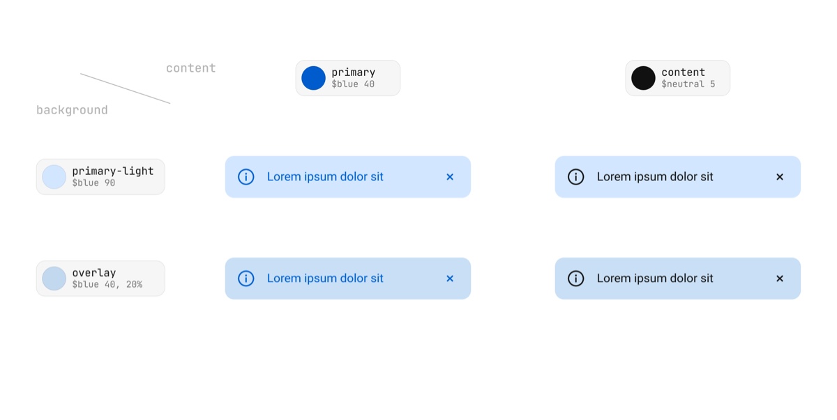 语义模版适用于设计系统内颜色、尺寸、间距、字体等所有 Design Tokens 的命名,针对颜色来说,我们只需要选取其中部分节点,拼装成适合我们应用场景的语义模版即可,比如笔者在当前项目中使用的是一套借鉴了 Material Design 3 和 Asanas Design System 后设计的语义模版: theme-variant—property-mode-scale-state ,那么命名一个报错情景下的主文本用色就是 light-negative-content(后面几项为默认值因此省略)。