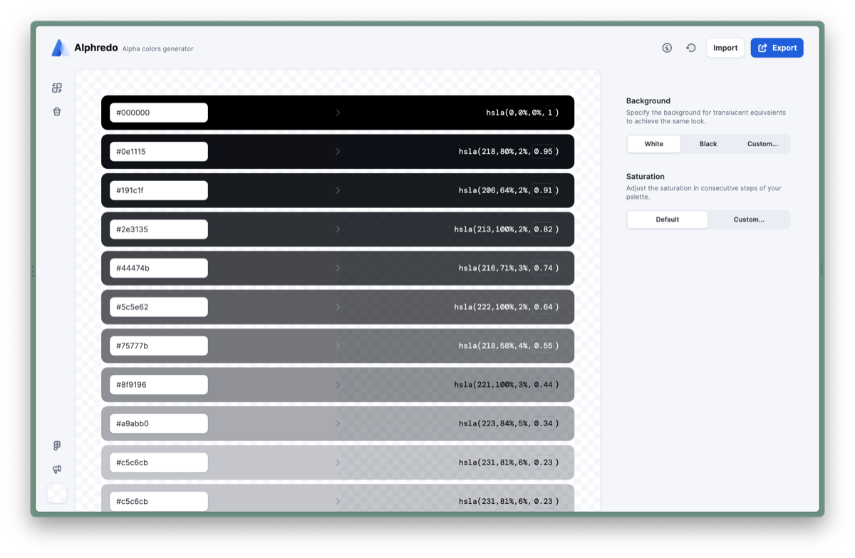 其次, 有没有办法生成带 alpha,同时感知亮度一致的基础色板 ?答案是可以,使用 Alphredo,可以将我们导入的颜色自动生成带 alpha 但是看起来完全一致的颜色,具体的介绍可以看开发者的 介绍视频 。