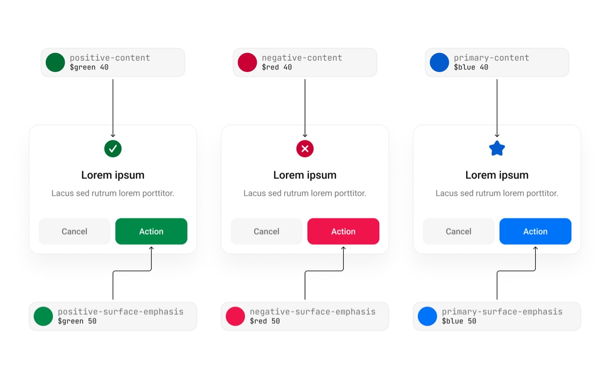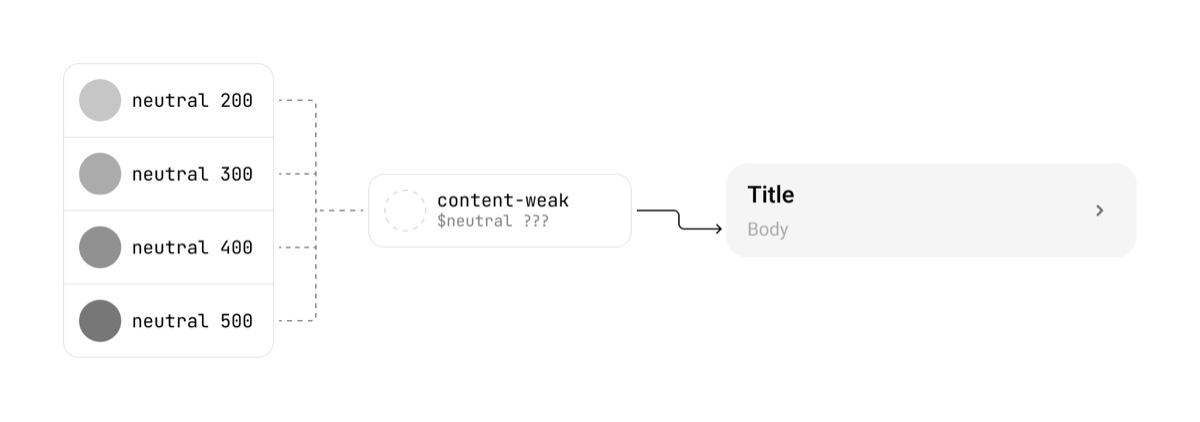 如果我们在语义模版中加入像 element 或 component 节点,会收窄语义的应用范围,即精度更高,粒度更细。举个🌰例子,以 component-property-variant 模版命名按钮背景色 button-bg-primary,那么该颜色仅能应用在 button 的 primary 样式的 default 状态上,非常明确,毫无歧义,但是如高精度的语义从系统一致性的角度看,意味着我们需要为所有 UI 元素都单独命名!这会导致语义别名数量爆表,非常臃肿,生产成本也随着上升。