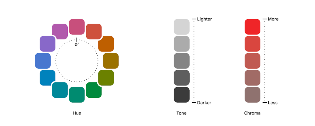 ▲ HCT 由 hue、chroma、tone 构成,hue 与 chroma 来自 CIMA16,tone 来自 Lab 的 L| 图片来自 Designing Harmony into Dynamic Color