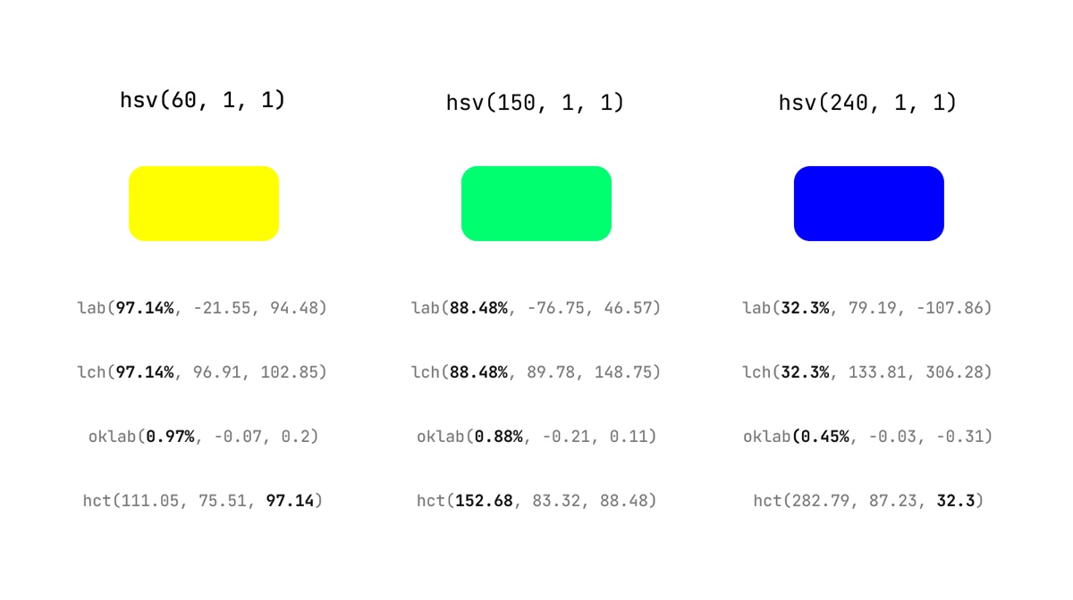 ▲ Lab、LCH、OkLab、HCT 色值,其中标重的数值为亮度,其颜色的亮度与实际感知统一