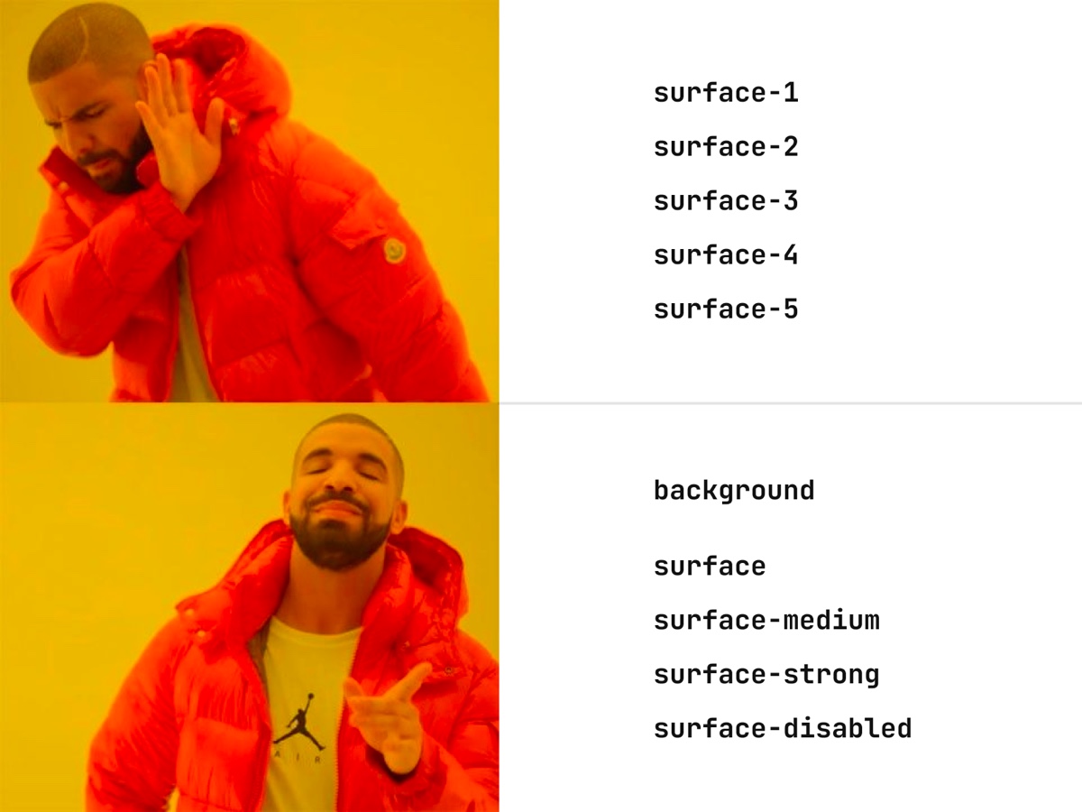 ▲ 不仅是色彩系统的命名,整个设计系统的命名都让人头秃 | 图片来自 @joeyabanks