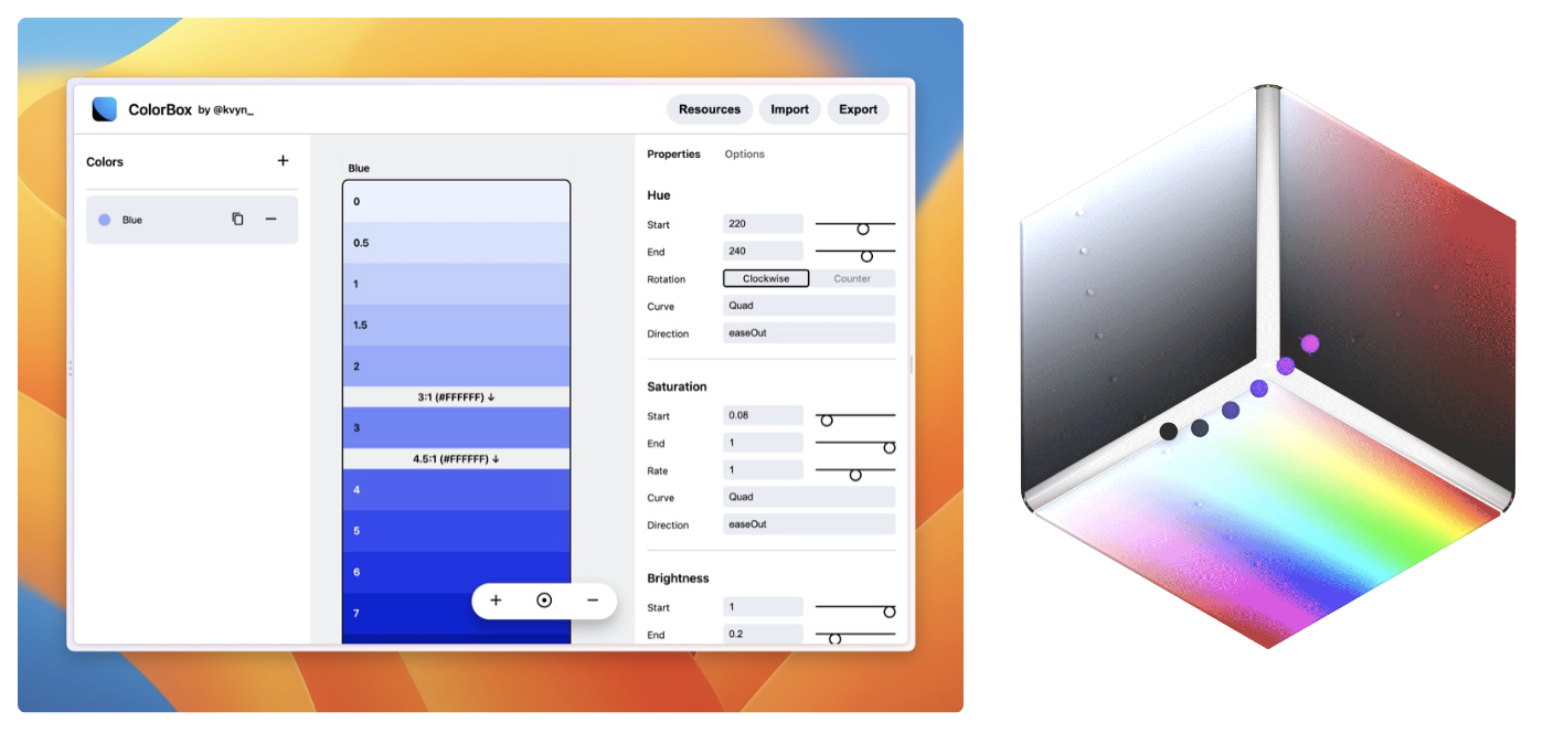 ▲ ColorBox 是基于 Lyft 团队的开源算法上线的 Web 工具,其原理是为颜色的 hue、saturation、value 分别设定数值范围(Rang)和插值曲线(Curve),相当于创造了一条在 H S V 三维空间内的连续曲线,而最后输出的色板就是设定的梯度序列在曲线上的取色的集合。