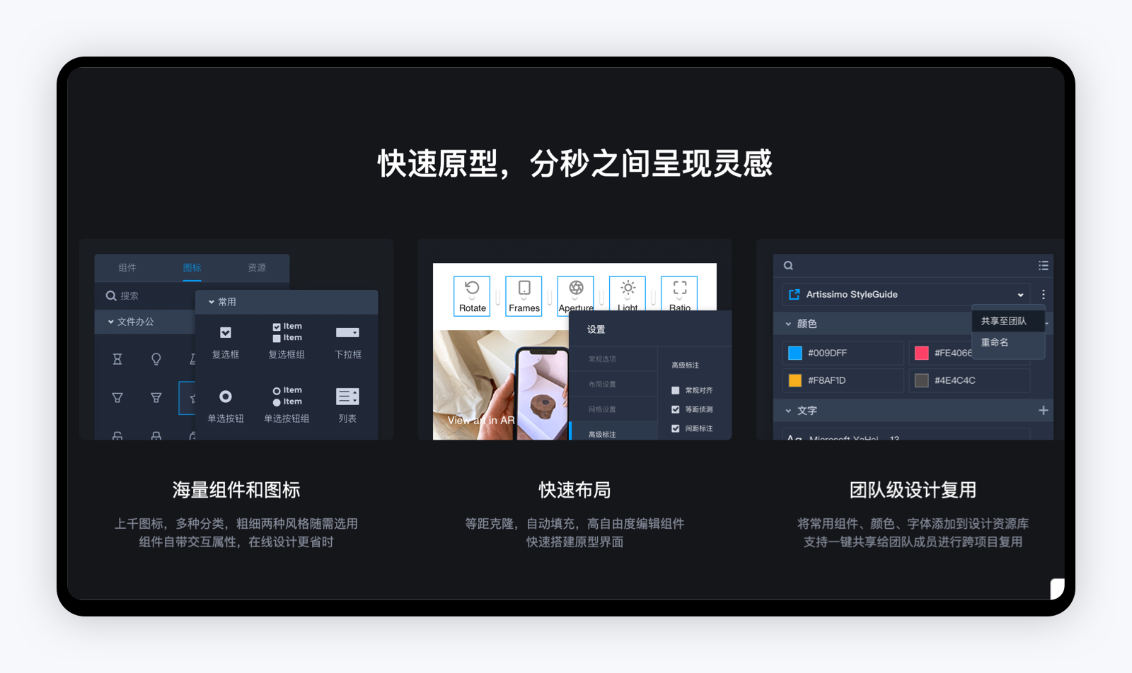 ①「即时原型」目前的操作体验较粗糙,不能自由添加画板,也无法像设计工具一样实用,相对死板;资源库提供了图标、图表等通用基础组件,但版本都比较老了;提供历史版本记录;支持文件离线下载,可下载图片、PDF、离线演示包。