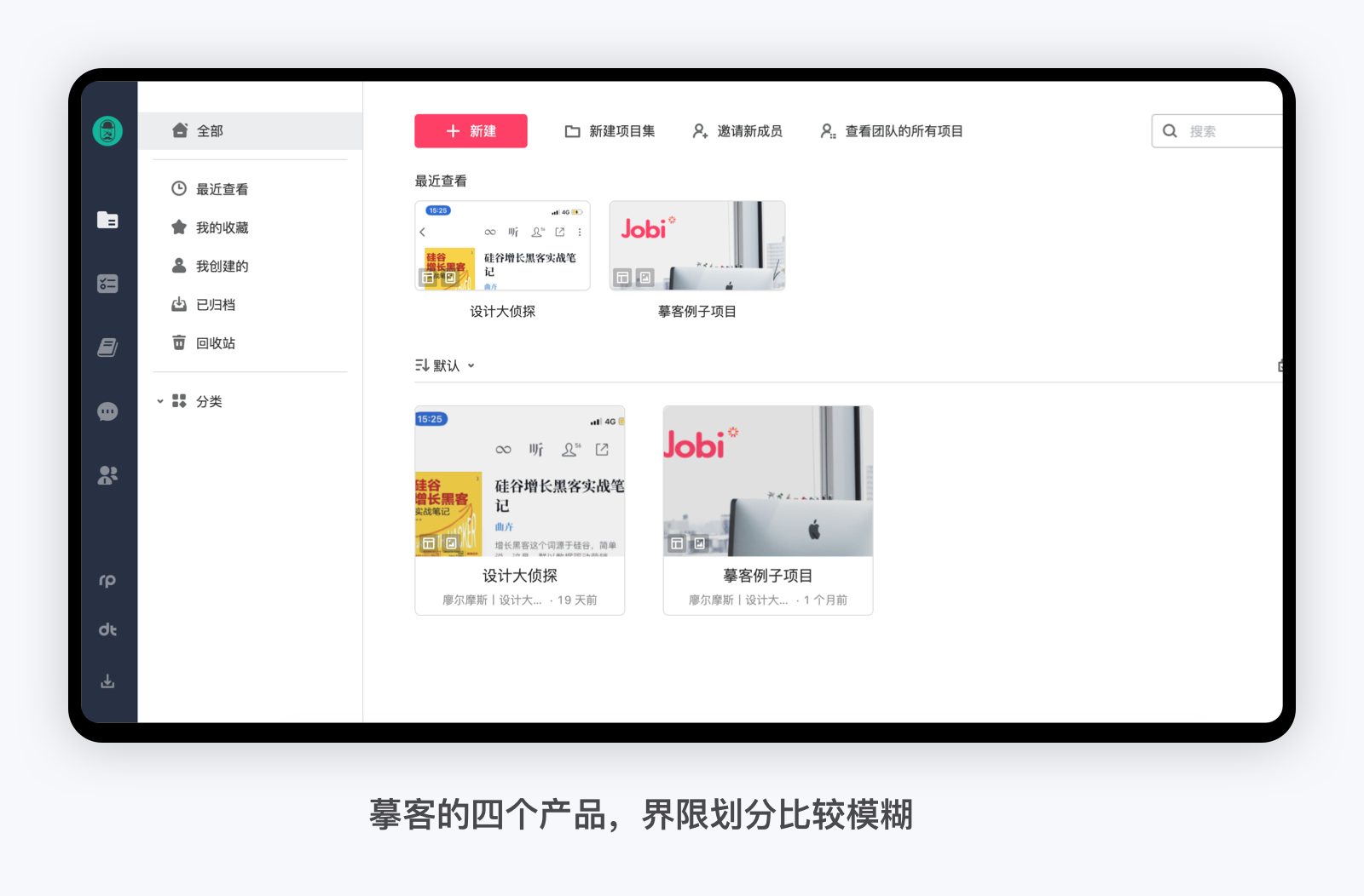 摹客的产品,主要是在线协作、摹客RP、摹客DT和设计规范这四个。但当我完整的体验下来,我对几个产品的划分界限感到非常模糊。再加上几个软件并没有实现完全连接,很多时候会带来焦虑感,比如我在哪里,我在使用什么软件。如果这四个产品要保持独立的发展,那么需要有明确的界限,否则用户会容易迷失,无法建立对产品的忠诚度。