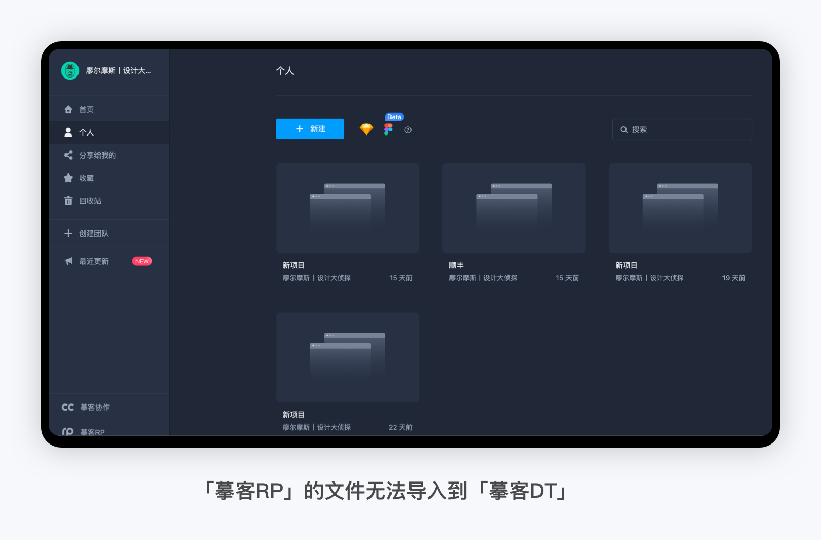 当我在RP完成原型设计以后,我发现这份RP文件竟然无法载入到「摹客DT」进行界面优化设计。这就像一个封闭的孤岛,原型和界面设计需要分别从0到1去设计,这失去了高保真设计的意义。所以「摹客RP」和「摹客DT」需要快速打通,这是一个非常急迫的需求。在获客成本如此高昂的今天,时间就是金钱。