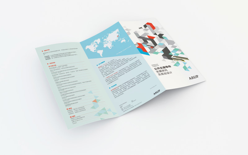 就拿这个折页的封面来举例吧,因为我不是在广告公司,前期不会有摄影师帮你拍摄素材,后期也不会有修图公司帮你修图,所以基本上根本没有任何素材可以用,而这个折页要宣传的内容又是交通枢纽周边的城市设计,而交通枢纽就包括了地铁,火车,飞机等等,要从网上找到一张同时包含这些元素在里面的图片基本是不可能的,所以我就采用了这种抽象的表达方式,用菱形大致堆叠出一个城市楼群的形状,再穿插进各种交通工具。