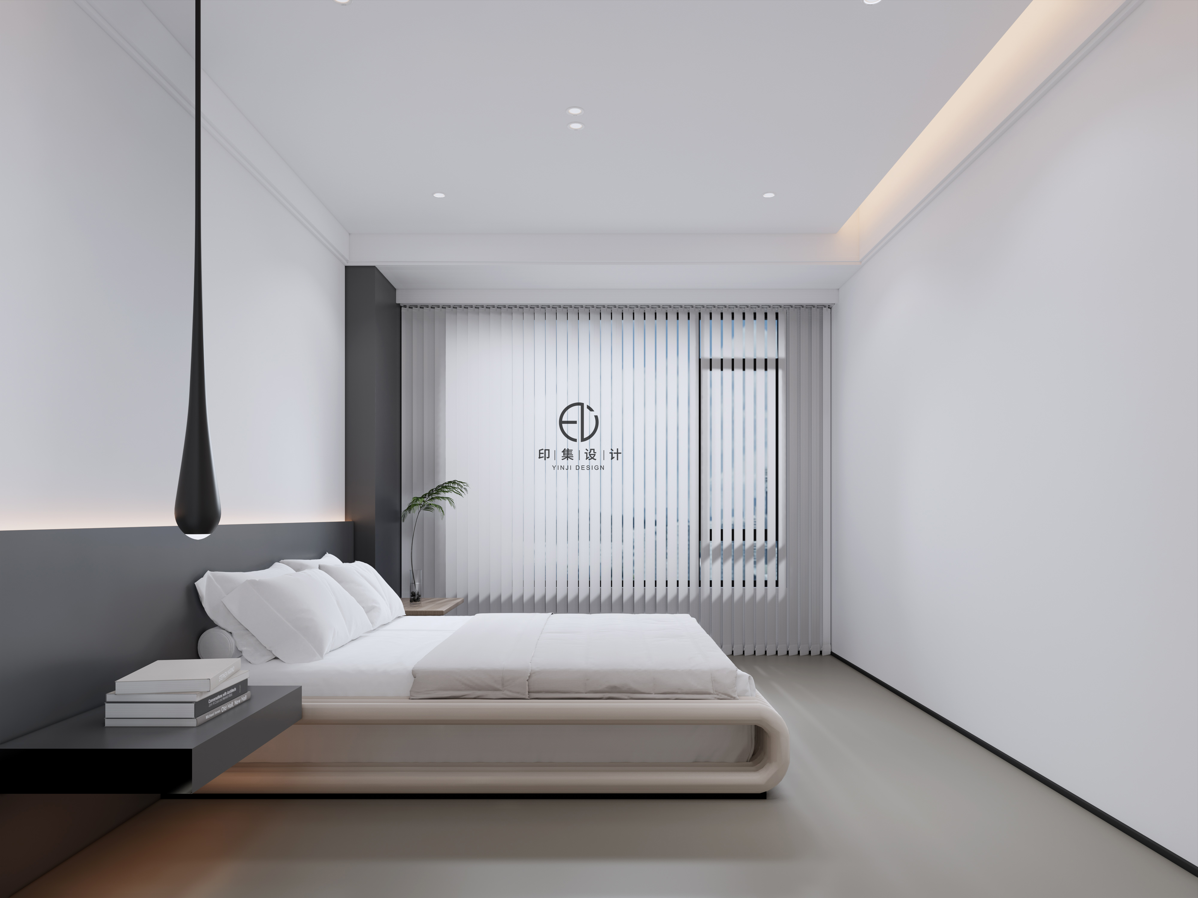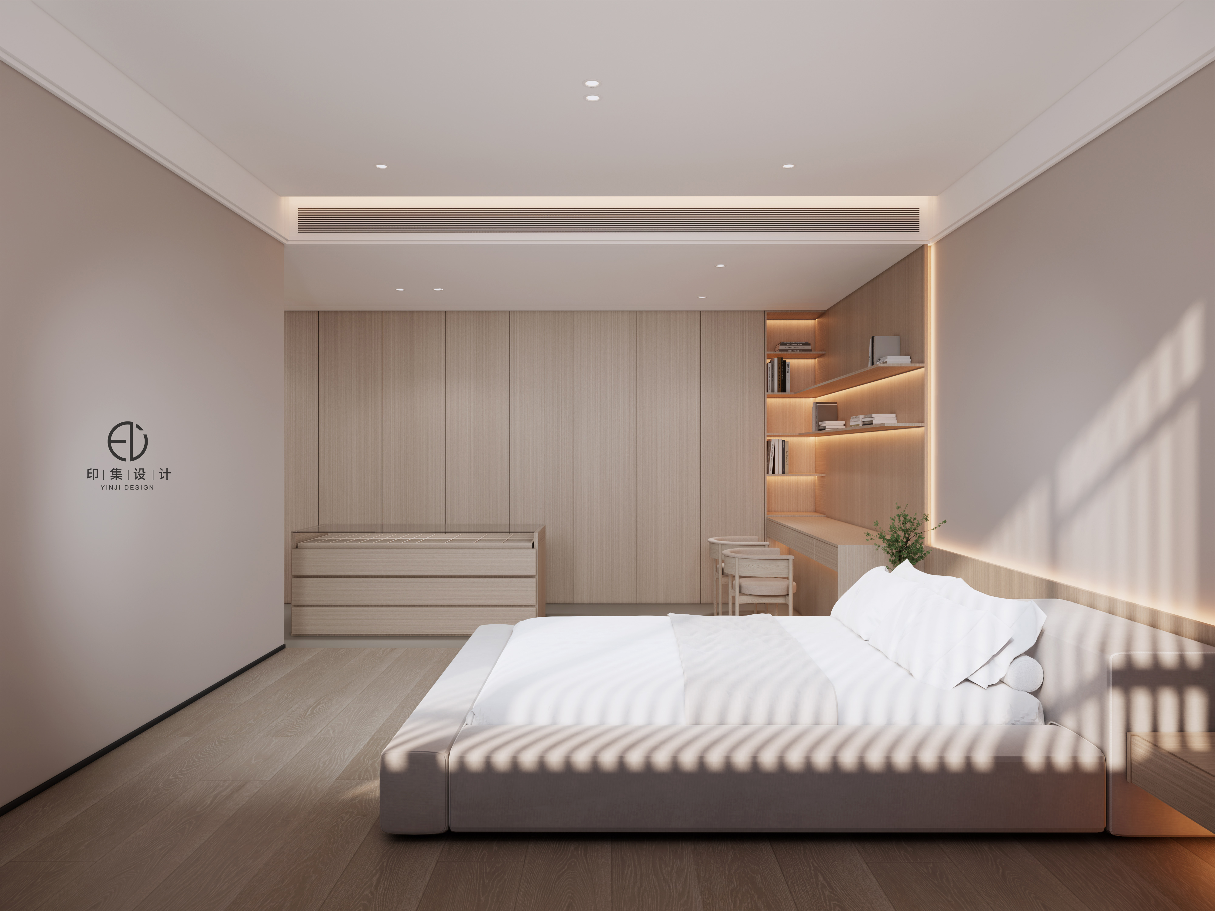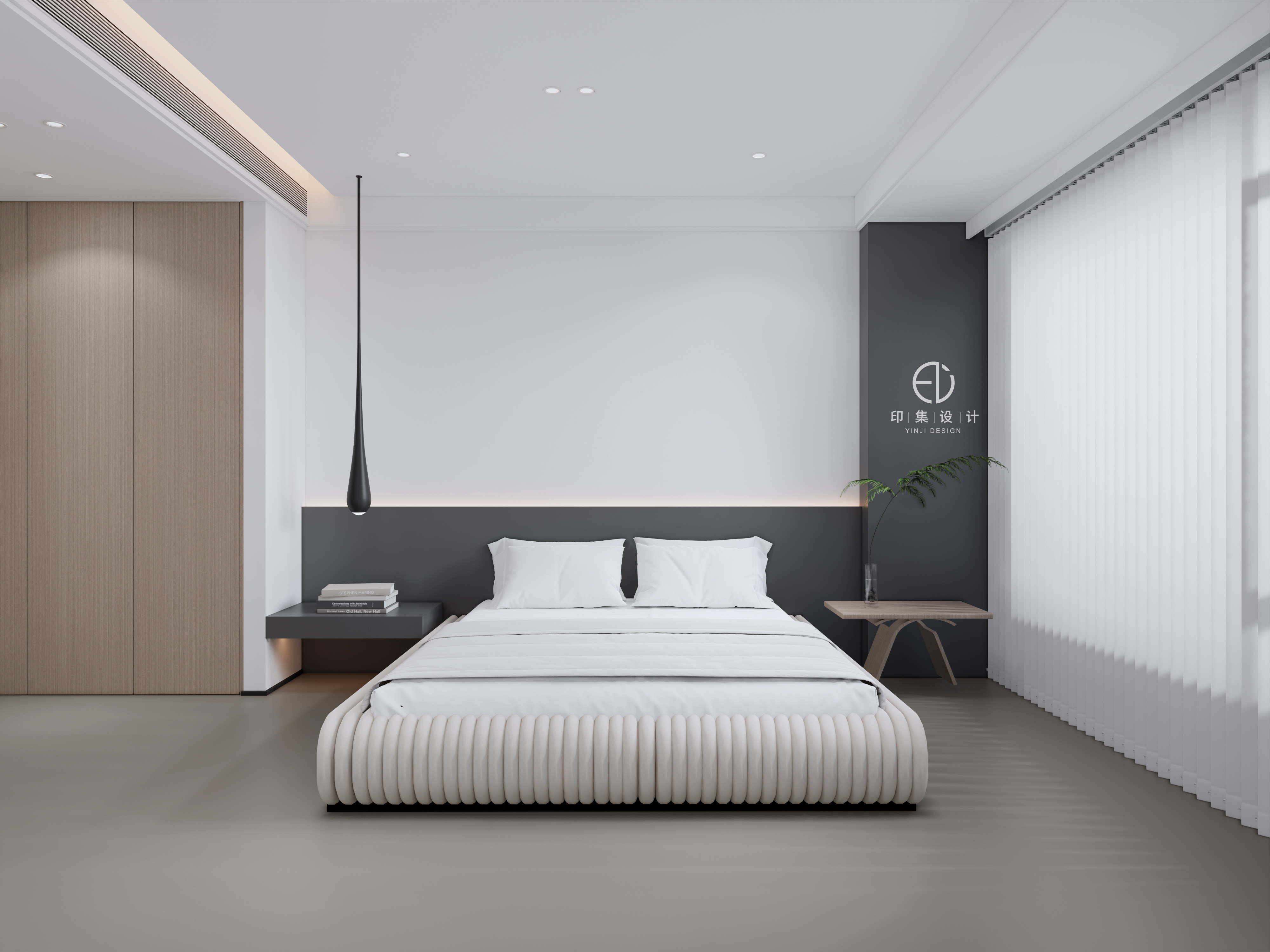 次卧采用大面积的留白设计,没有繁复的元素渲染,仅几笔横竖线条的简单勾勒,简而高级,纯粹自然。