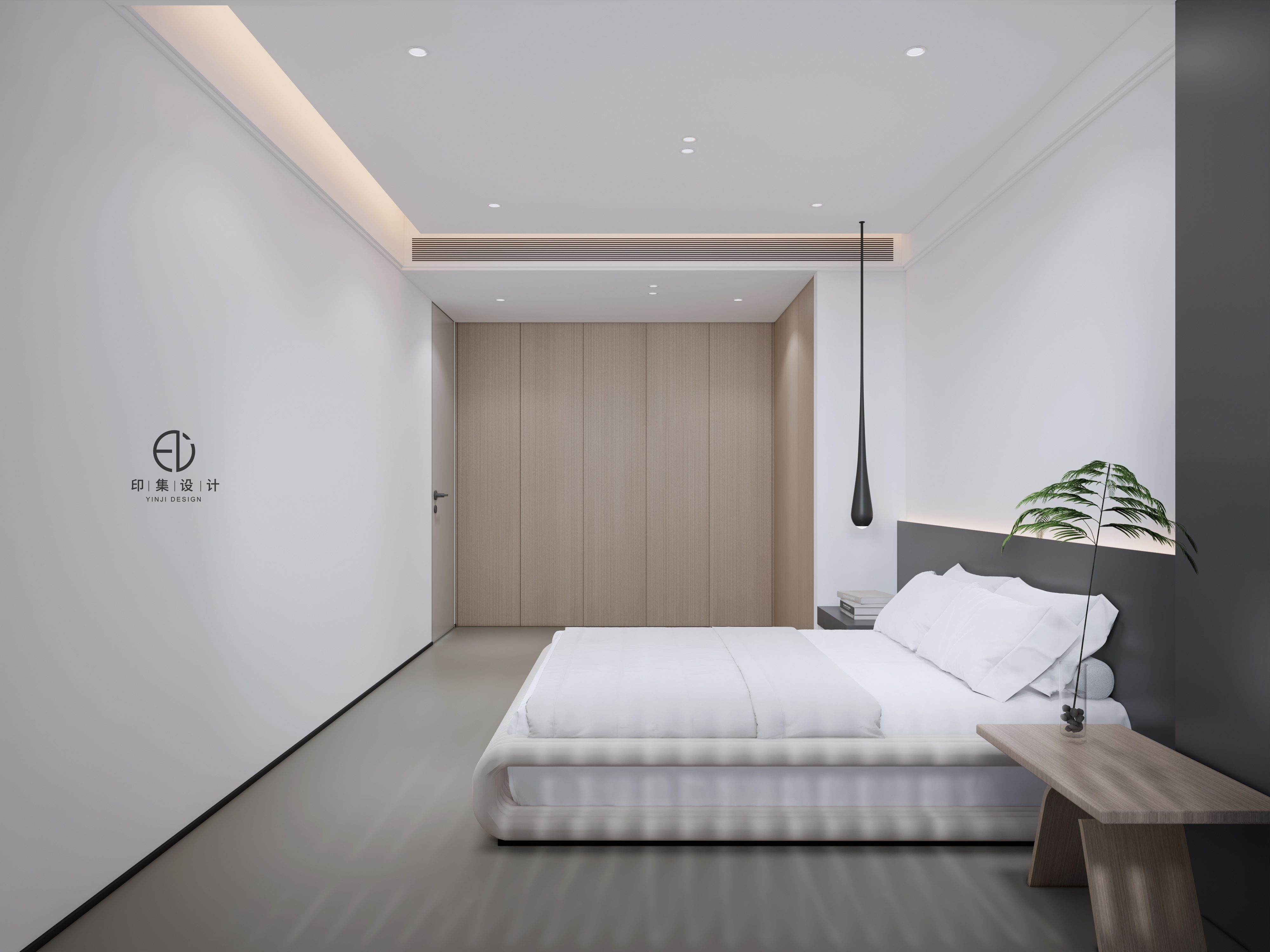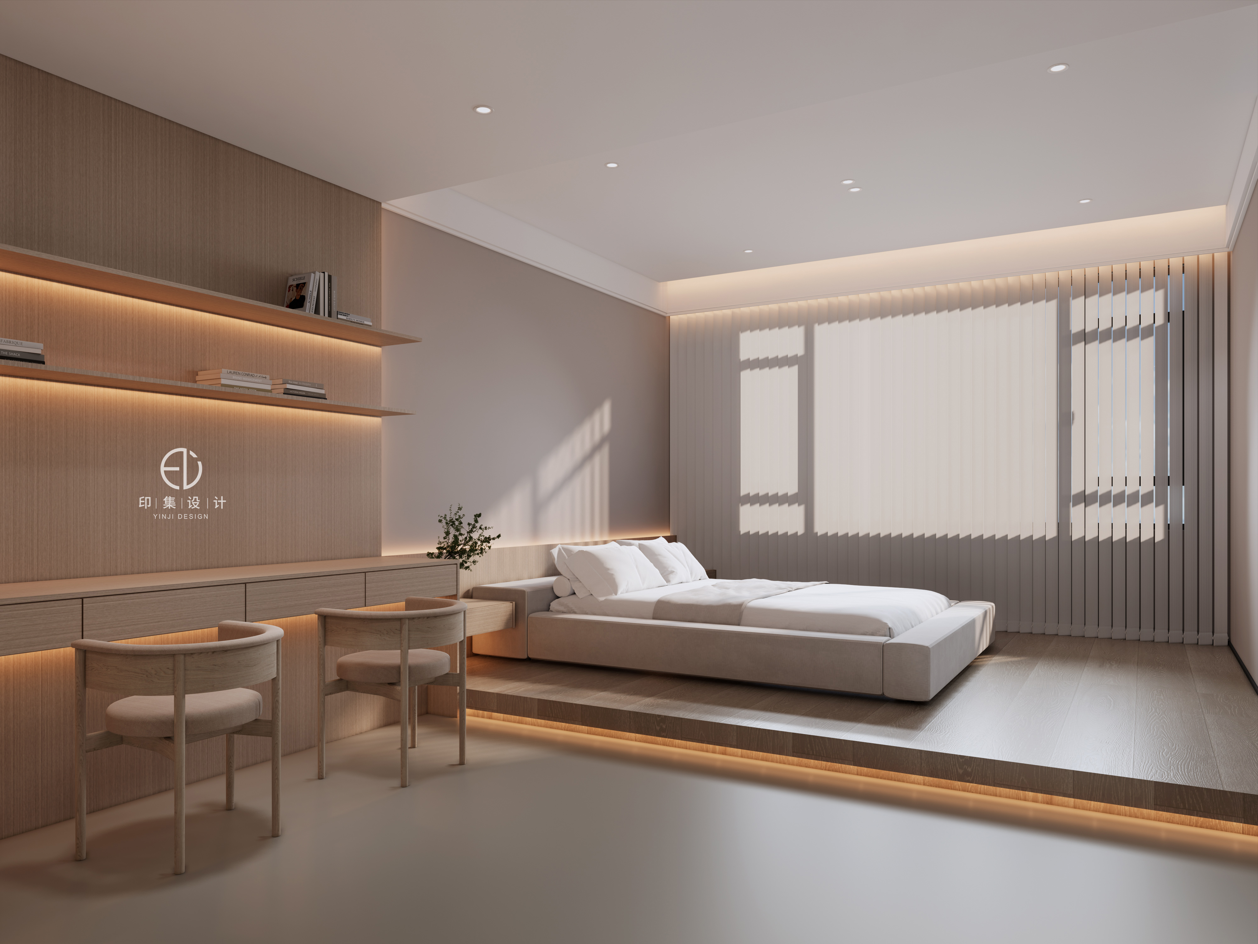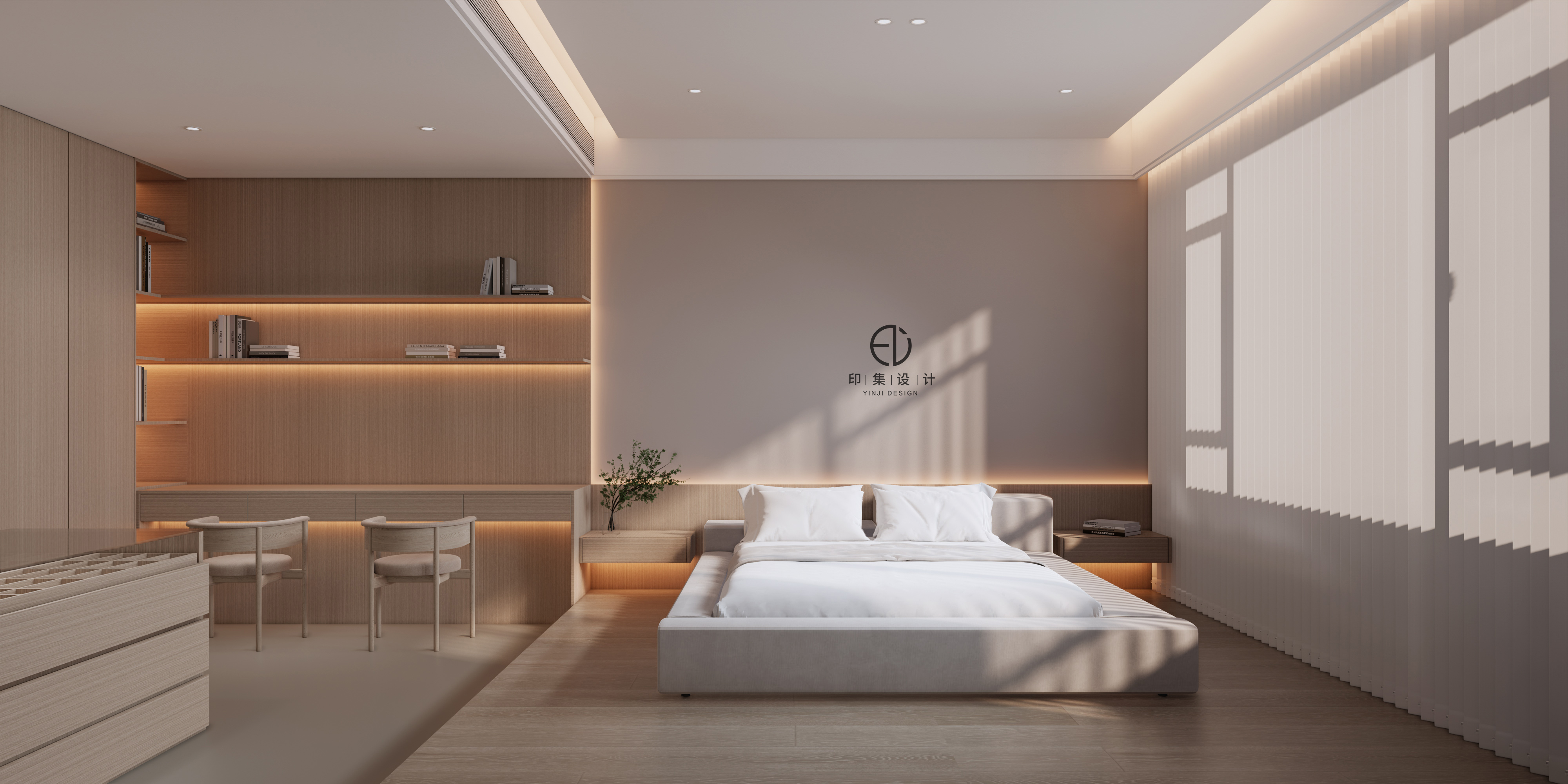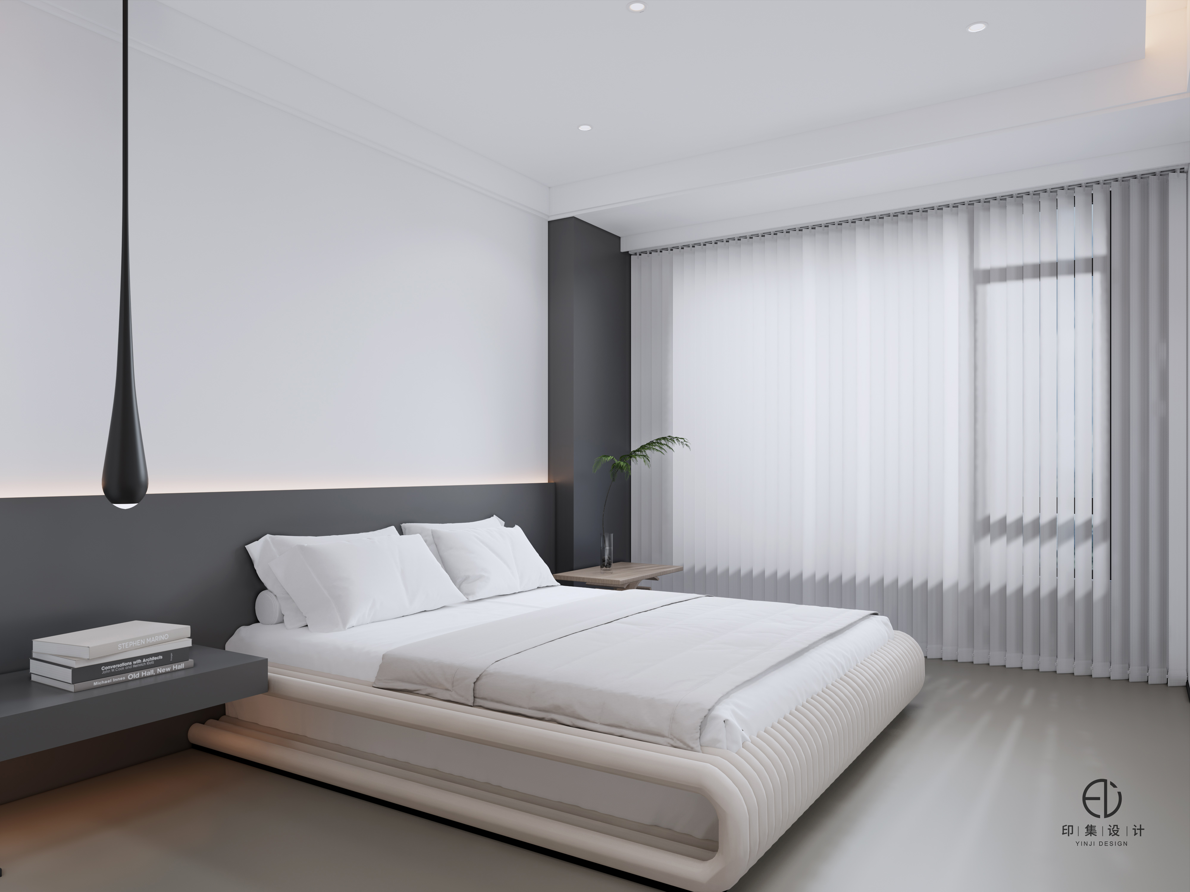 次卧采用大面积的留白设计,没有繁复的元素渲染,仅几笔横竖线条的简单勾勒,简而高级,纯粹自然。
