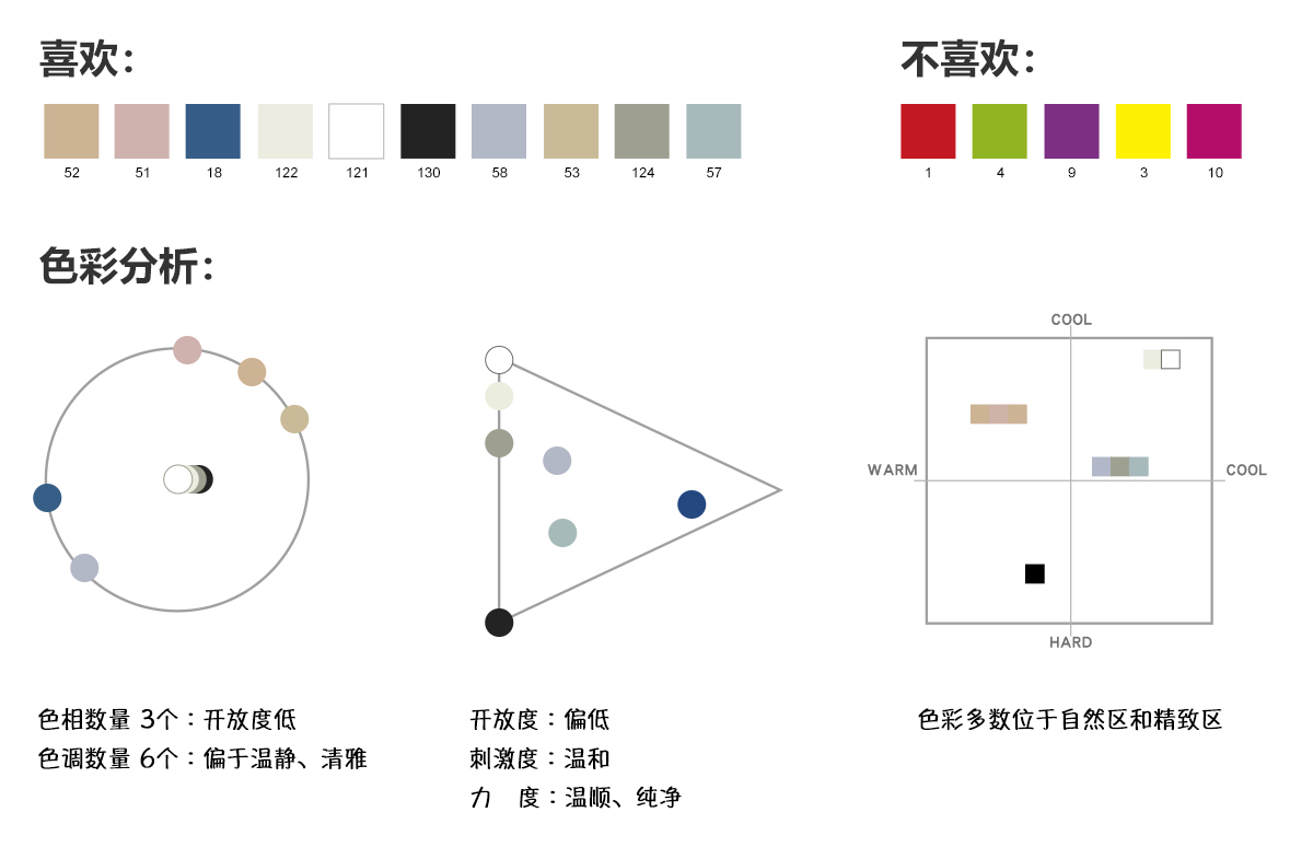 结合色彩分析得出:业主喜爱开放度低、温静、清雅的色彩,想要自然和精致的整体效果。