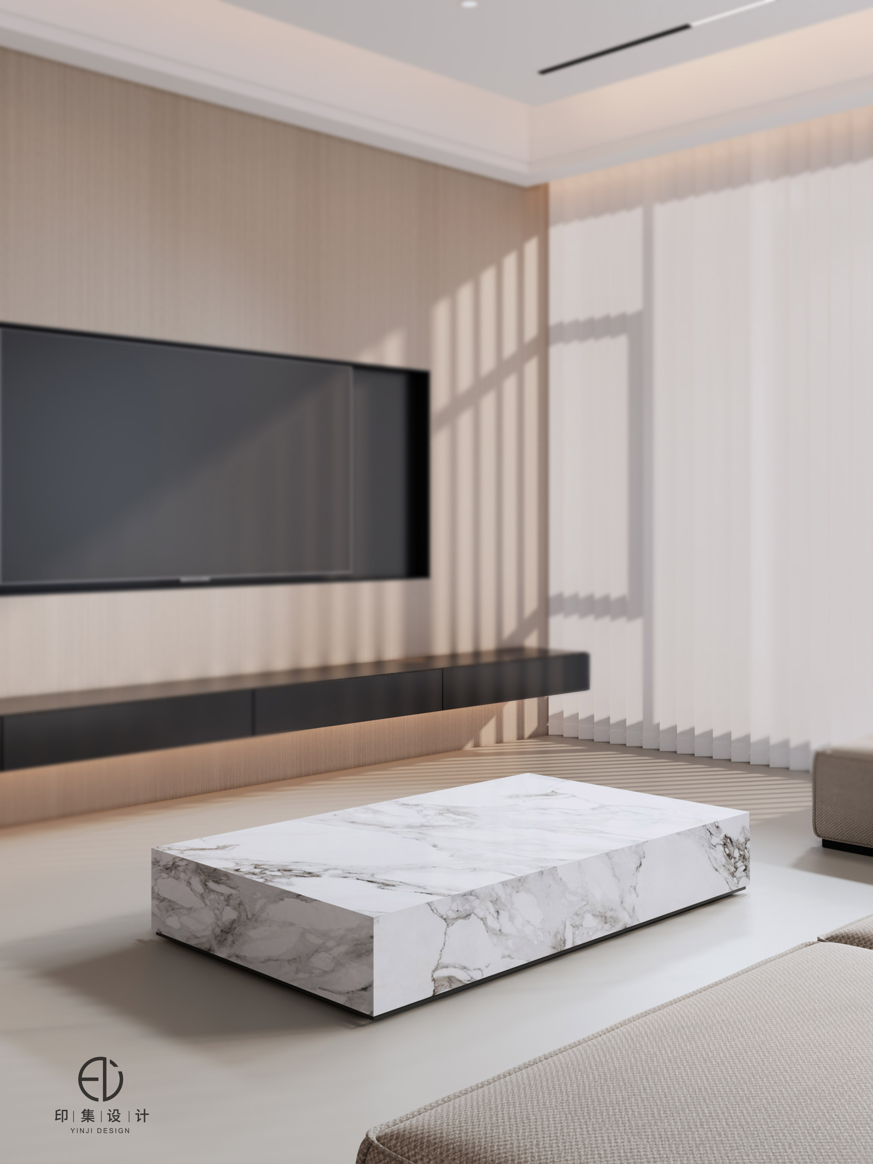 黑色、木色和白色是深浅之色的搭配融合,窗边的大理石茶几是一幅墨色晕染的山水画卷,浓淡得宜,雅致清新。