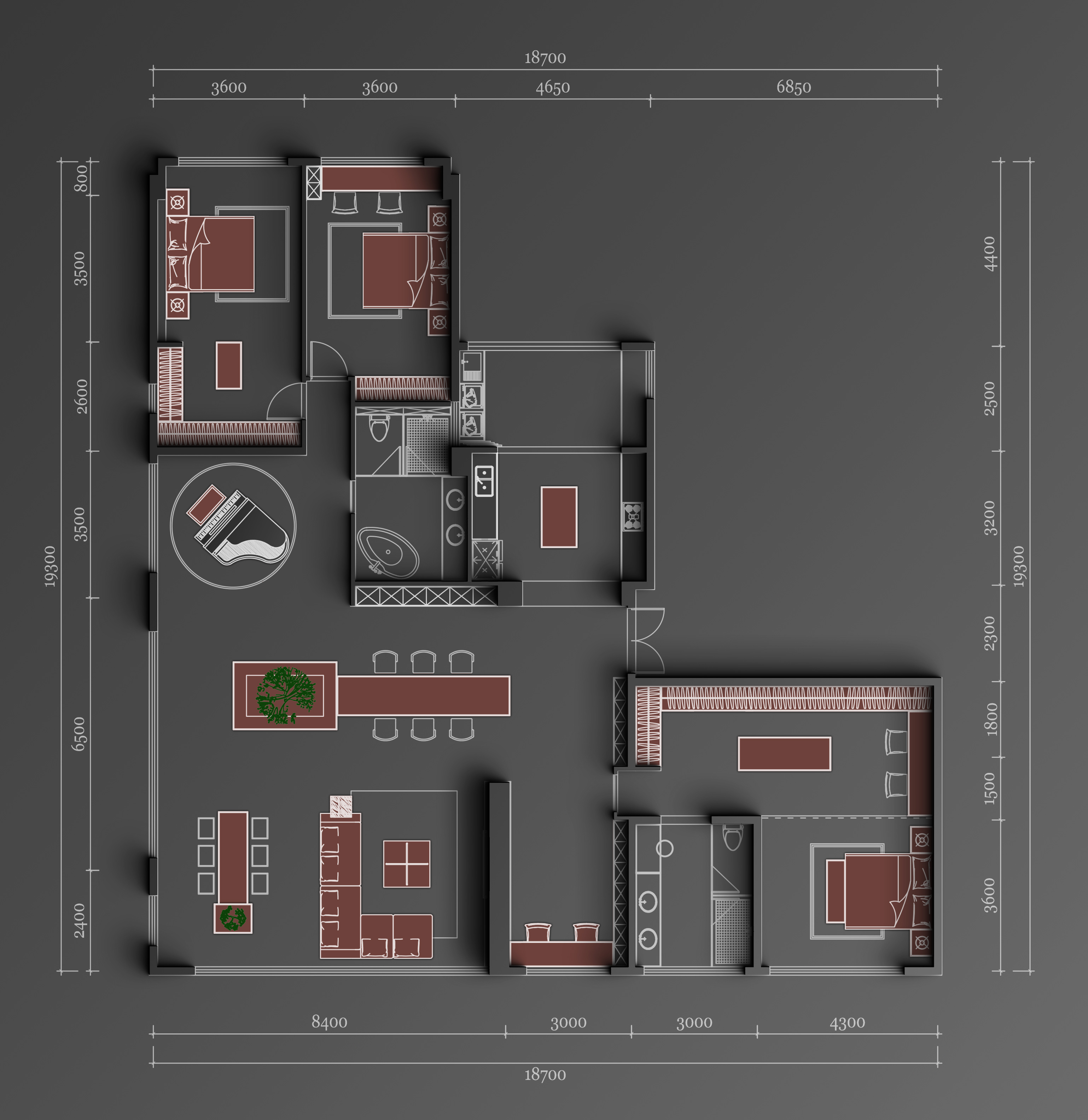 3、主卧将空间整合为宽大的衣帽间,设置错落层次的房间格局。