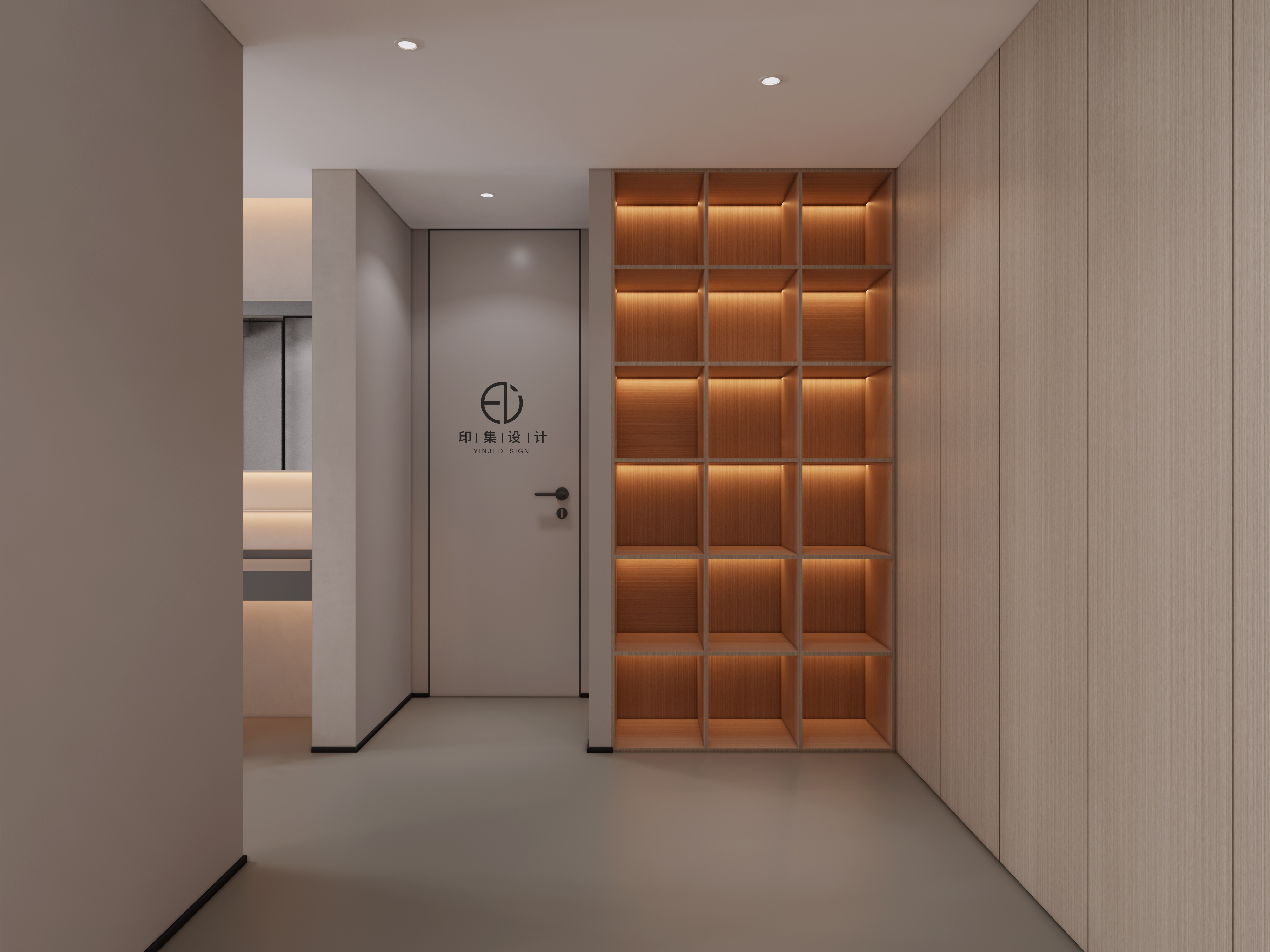 整面的木色柜体,静处着,散着她的古朴和无尽温柔。入户鞋帽柜的柜中、柜底悬空,储物换鞋便利。内嵌灯带,轻盈通透。整面柜体中部设有隐形门,连通主卧空间,增强主卧私密性。