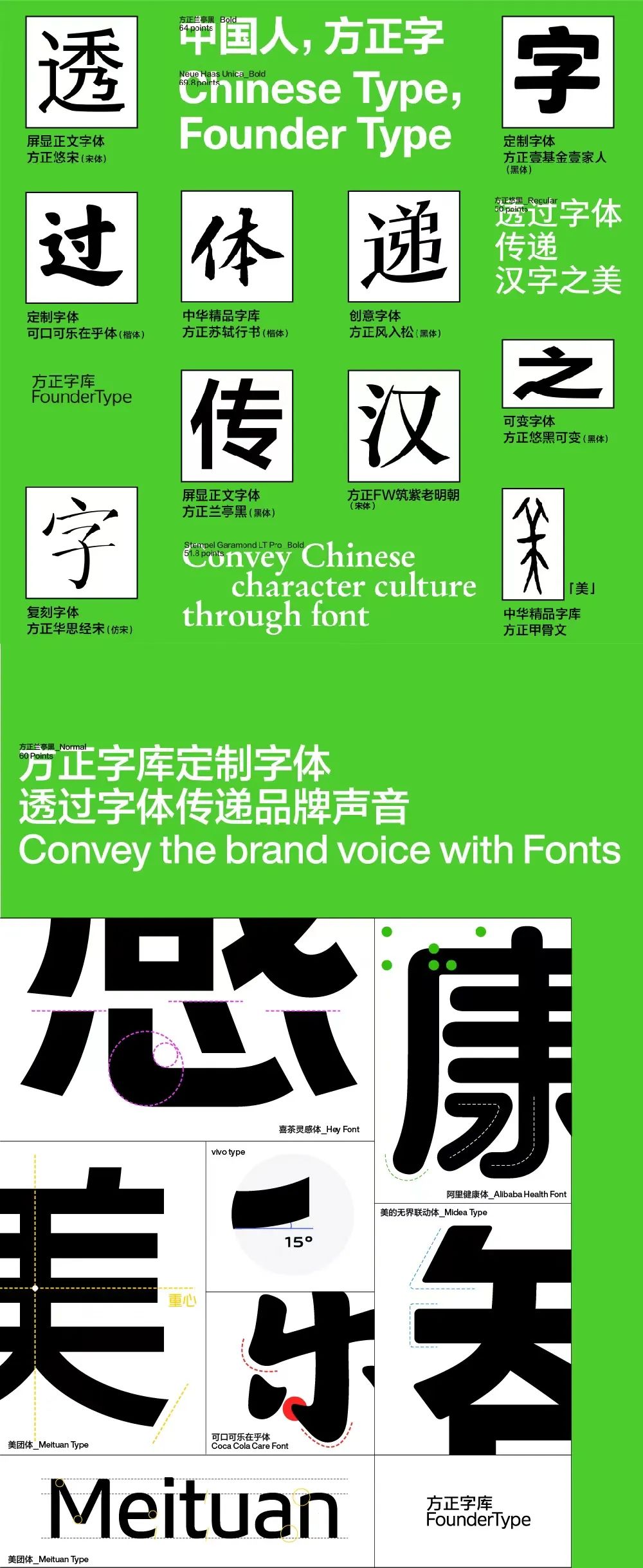 方正字库的定制字体服务,可以通过将字体样式与企业品牌定位融合共创,为企业打造标准化的专用字体。至今已与可口可乐、阿里巴巴、美团、京东、喜茶、壹基金等多个不同领域客户合作,打造了多款经典品牌定制字体,透过字体传递品牌价值。