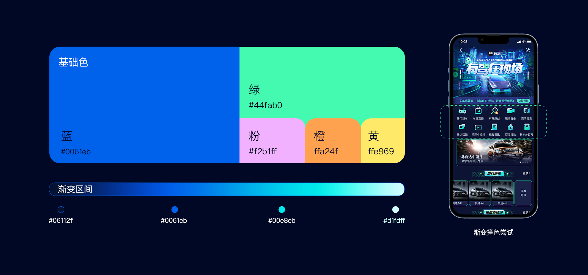 由于整体风格参考赛博朋克,配色方面基于有驾品牌色进行延展,辅助色起到平衡主色的冲击效果、活跃视觉,释放潮流激情,突出重点模块;元素上尝试渐变色丰富元素样式。