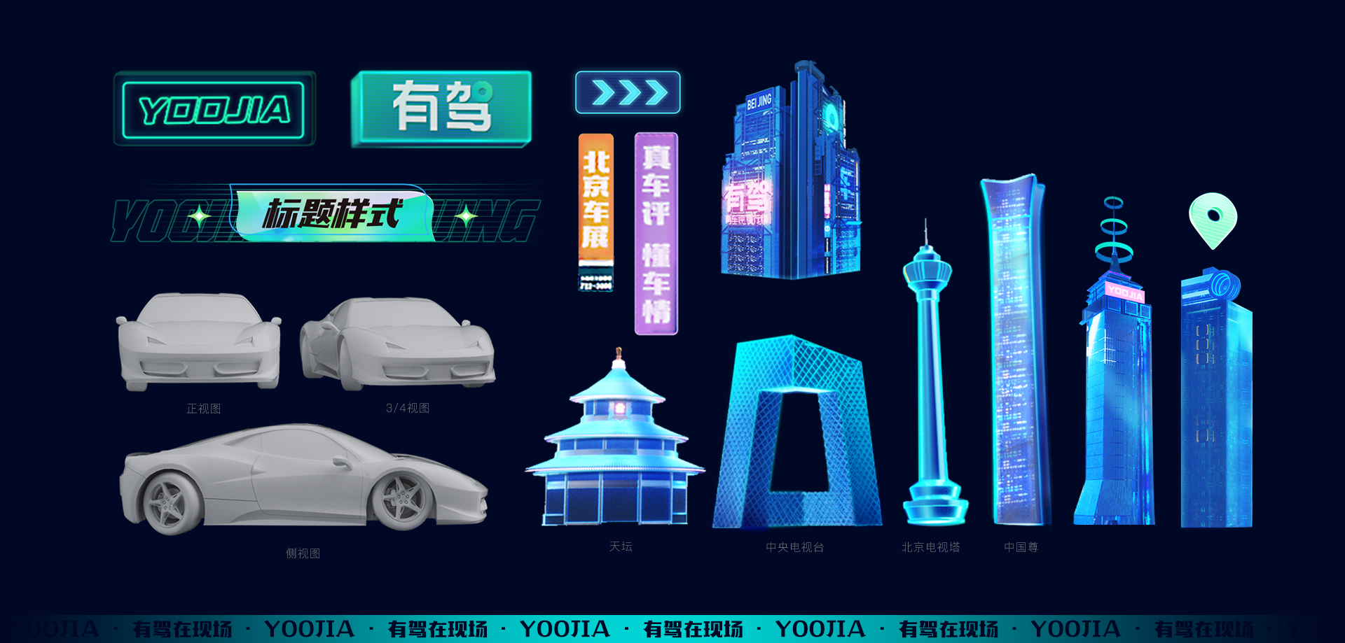 根据关键词确定了以赛博朋克风格为视觉基调,通过三维建模搭建北京地标建筑场景,搭配大胆的配色和新颖的元素样式打造潮流个性且具有未来感的视觉画面,匹配车展品牌的创新理念。