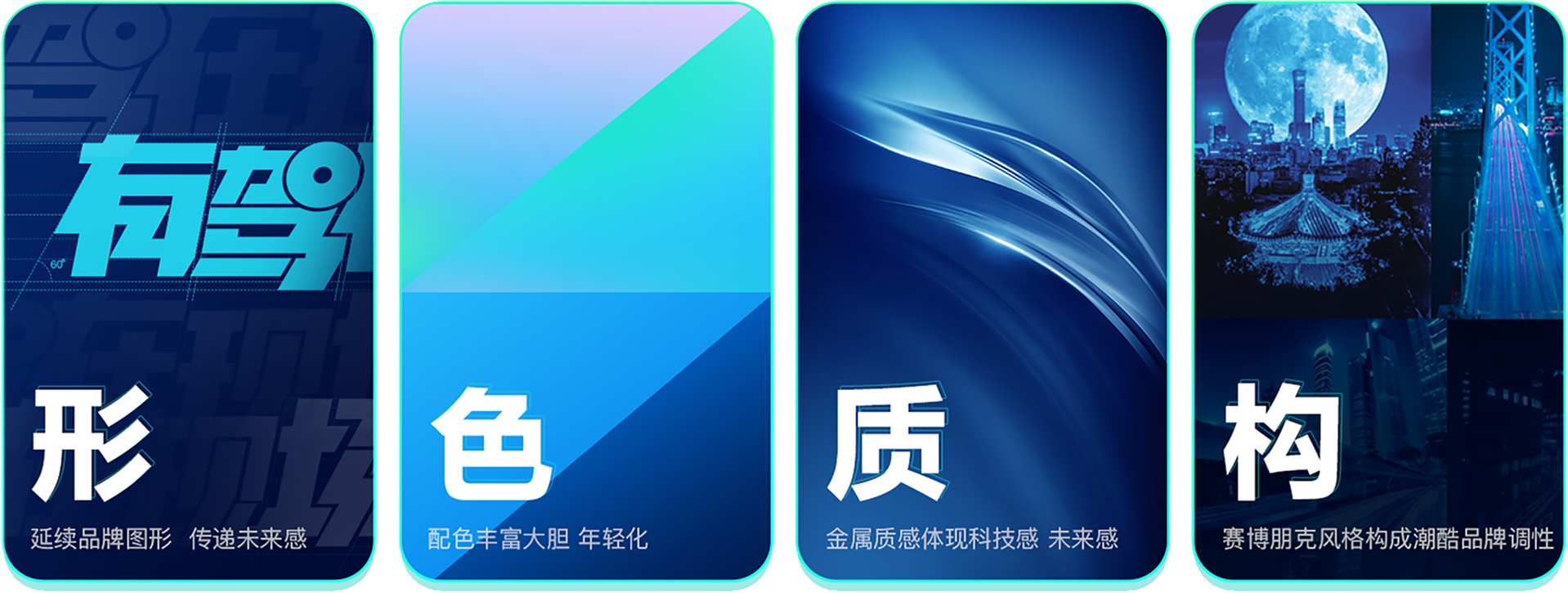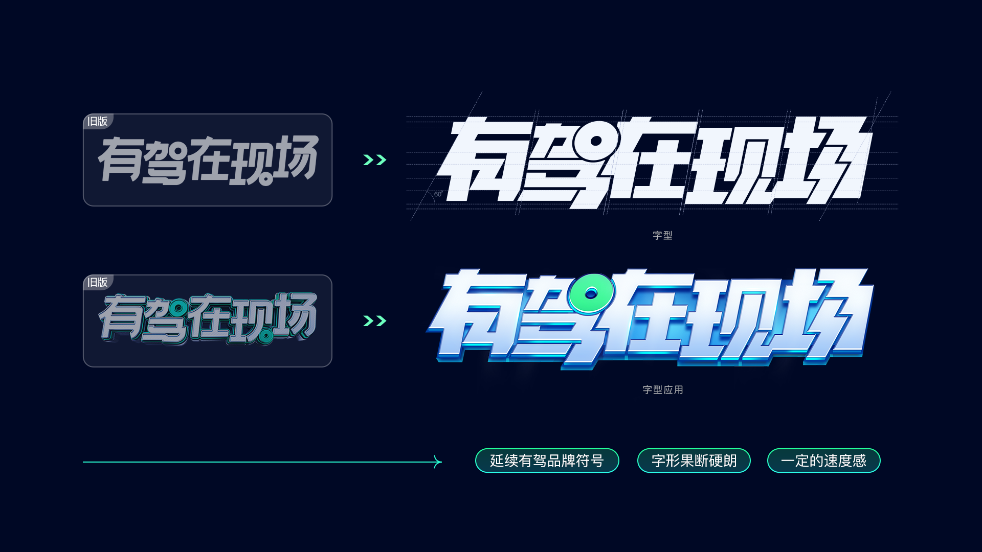 由于旧版的字体圆角等设计样式相对柔和,不能准确表现本次车展视觉调性。为了传递有驾车展的潮酷、未来感,设计上将旧版文字加粗,圆角调整为直角,并进行一定的倾斜处理,使字体展现更加果断硬朗;同时,我们将部分笔画进行连接,让字体充满动感或速度感;最终的字型效果运用有驾品牌蓝绿色光效以更好的与画面结合。