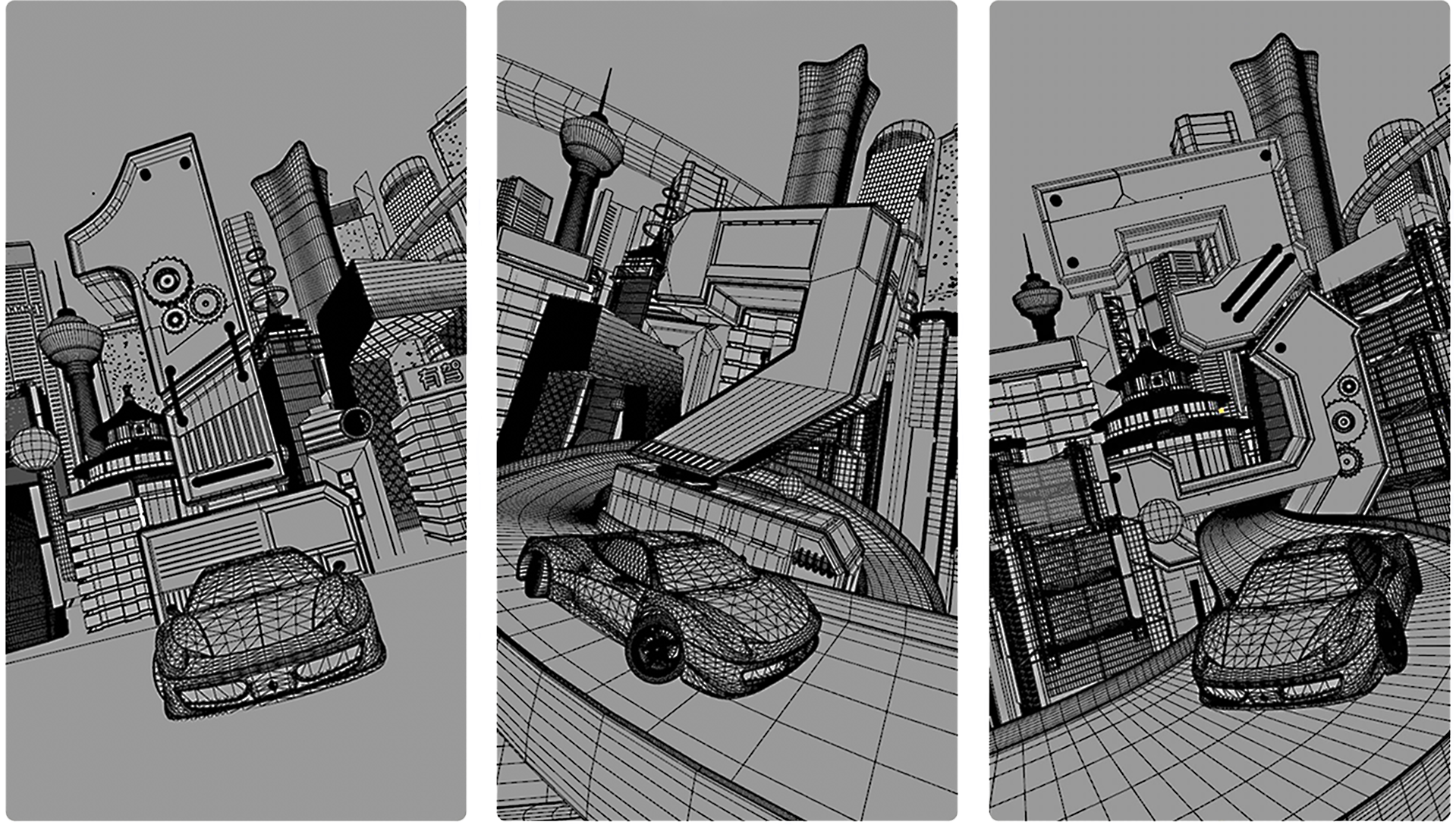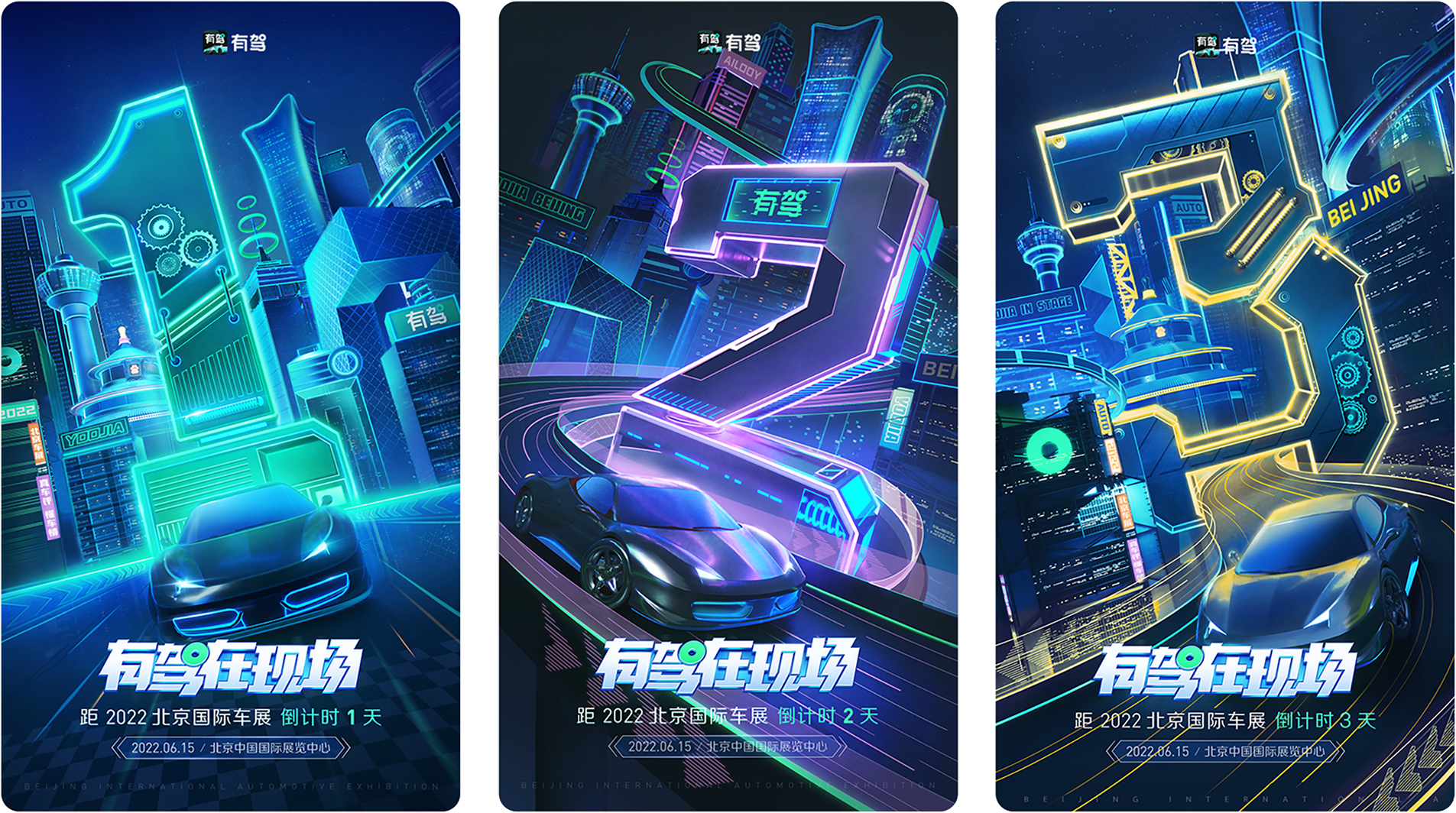 为了给车展开幕造势,我们尝试复用主KV的三维建筑模型,将倒计时1、2、3与不同视角、不同配色的场景相结合,整体风格和车展主视觉保持一致,输出了三张倒计时海报,丰富了整个项目的宣传内容。