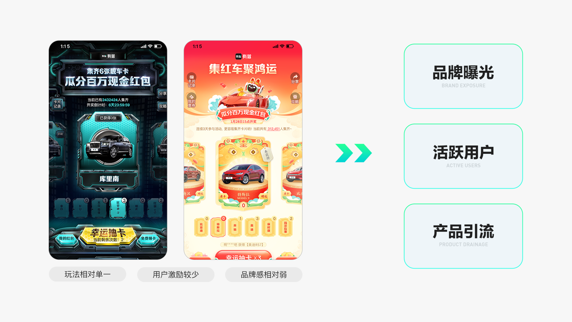 在玩法方面,本次集卡活动延续过往活动做任务得车卡的主玩法,优化活动体验,新增了合成稀有卡可参与大转盘抽奖的玩法以激励用户集卡,同时设立了车展大众日,在当天进入活动的用户可以获得现金红包,以此来激励用户回流,丰富活动玩法。