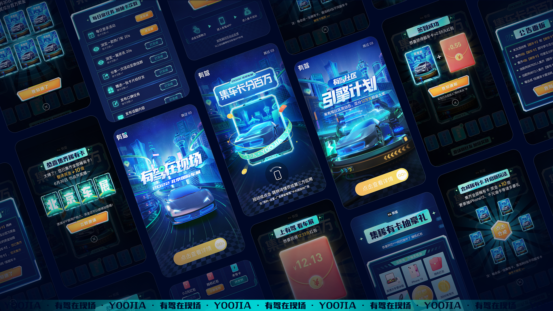 除了专题页和集卡活动,线上还包括端内社区活动设计,整体视觉调性都与我们输出的车展品牌vi保持统一。