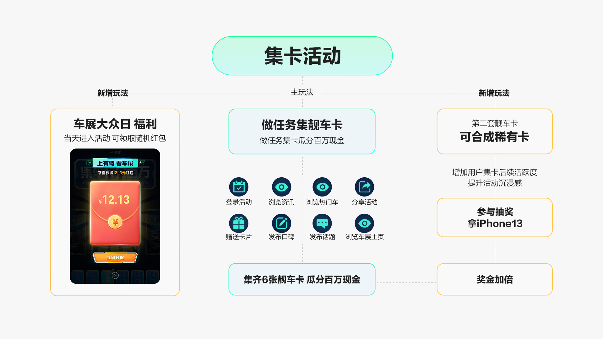 过往集卡活动不仅与产品、车展契合度高,并且收益明显,因此本次北京车展活动将复用、优化集卡类活动,让用户沉浸式集卡,从而提升用户活跃及量级。