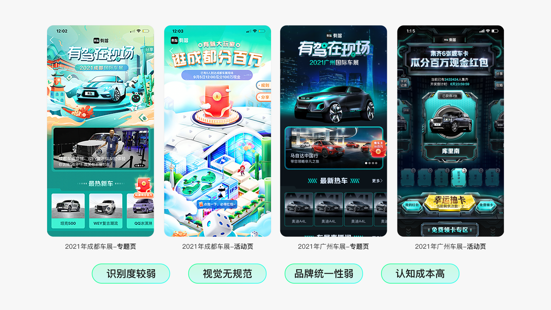 根据过往车展项目分析,总结发现存在品牌识别度较弱且没有统一规范、品牌统一性较弱导致用户认知成本较高等问题。
