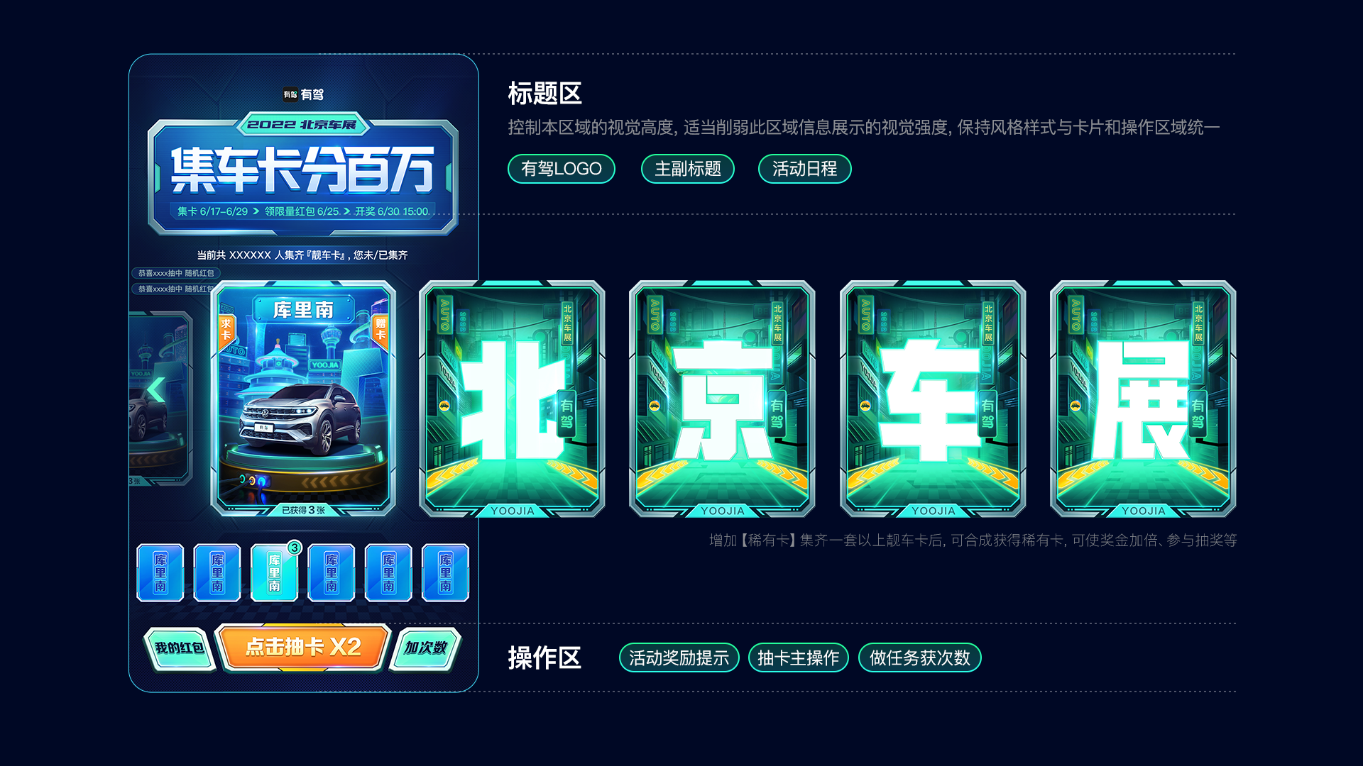 集车卡活动的主视觉元素及配色是依据vi规范,保证整体品牌调性的统一;普通靓车卡背景延续主视觉背景,稀有卡尝试不同配色和场景凸显其特殊性。