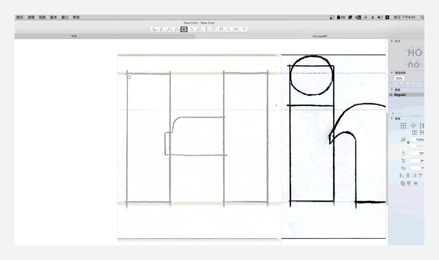 接下来,就用之前讲解的绘制工具搭建笔画结构,这块没啥难度,都是一些基础工具的组合应用。如果遇到一些造型复杂的曲线类笔画,可以先用钢笔工具,在曲线转折处进行大致的勾勒,然后再添加杠杆调整曲线,这样会比较高效一点。而且因为布点比较简洁,曲线的也会更加的顺滑。