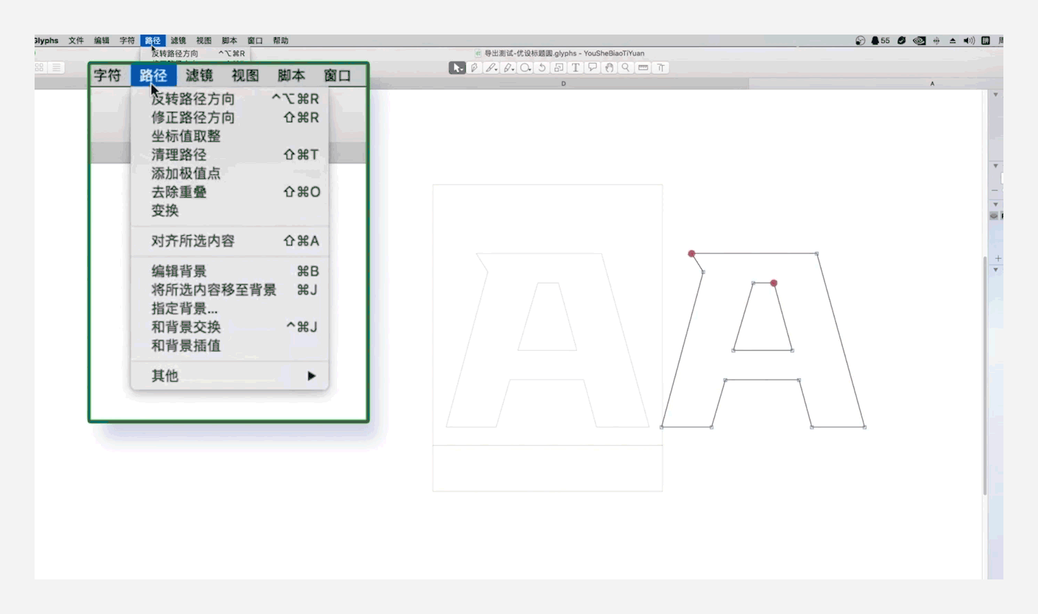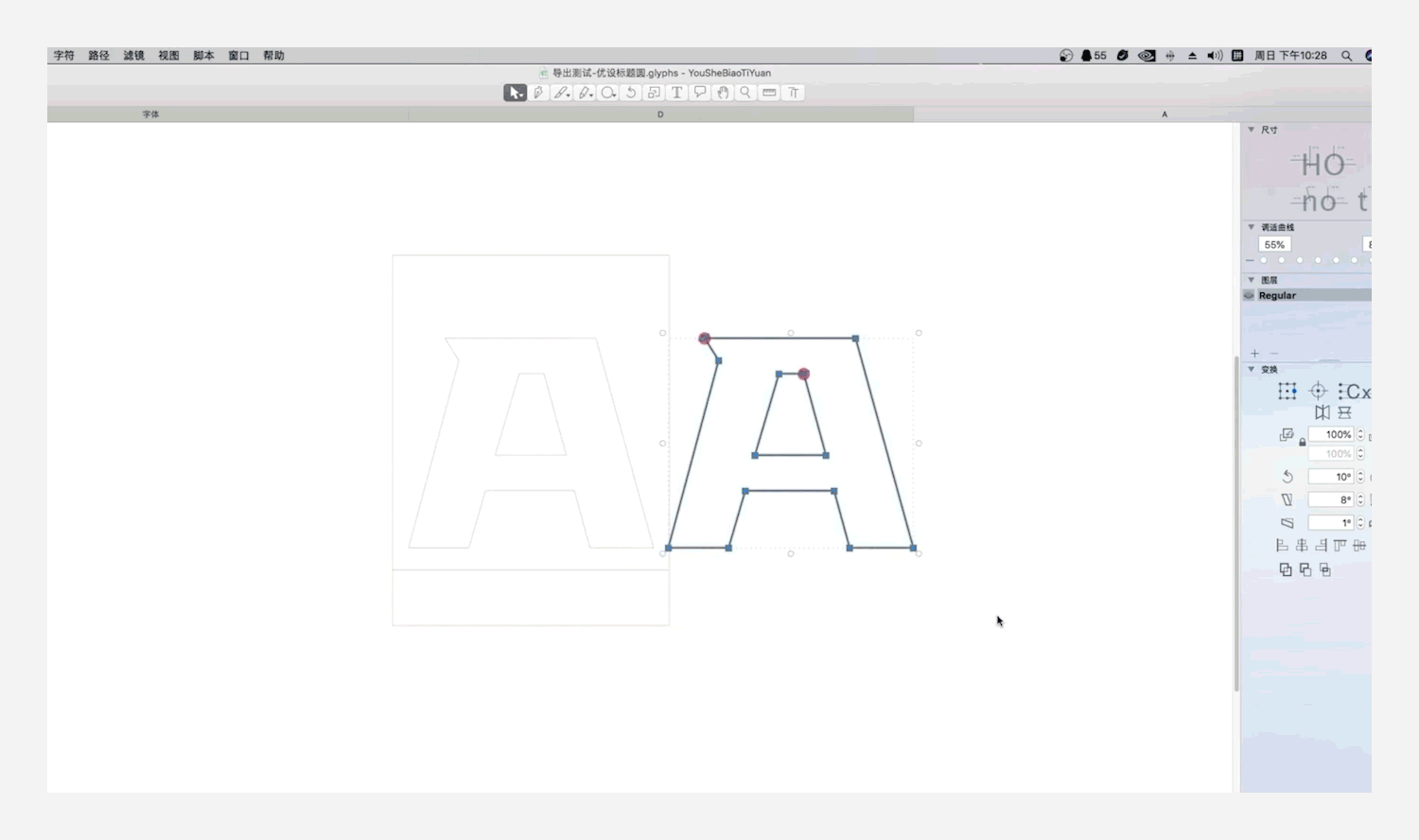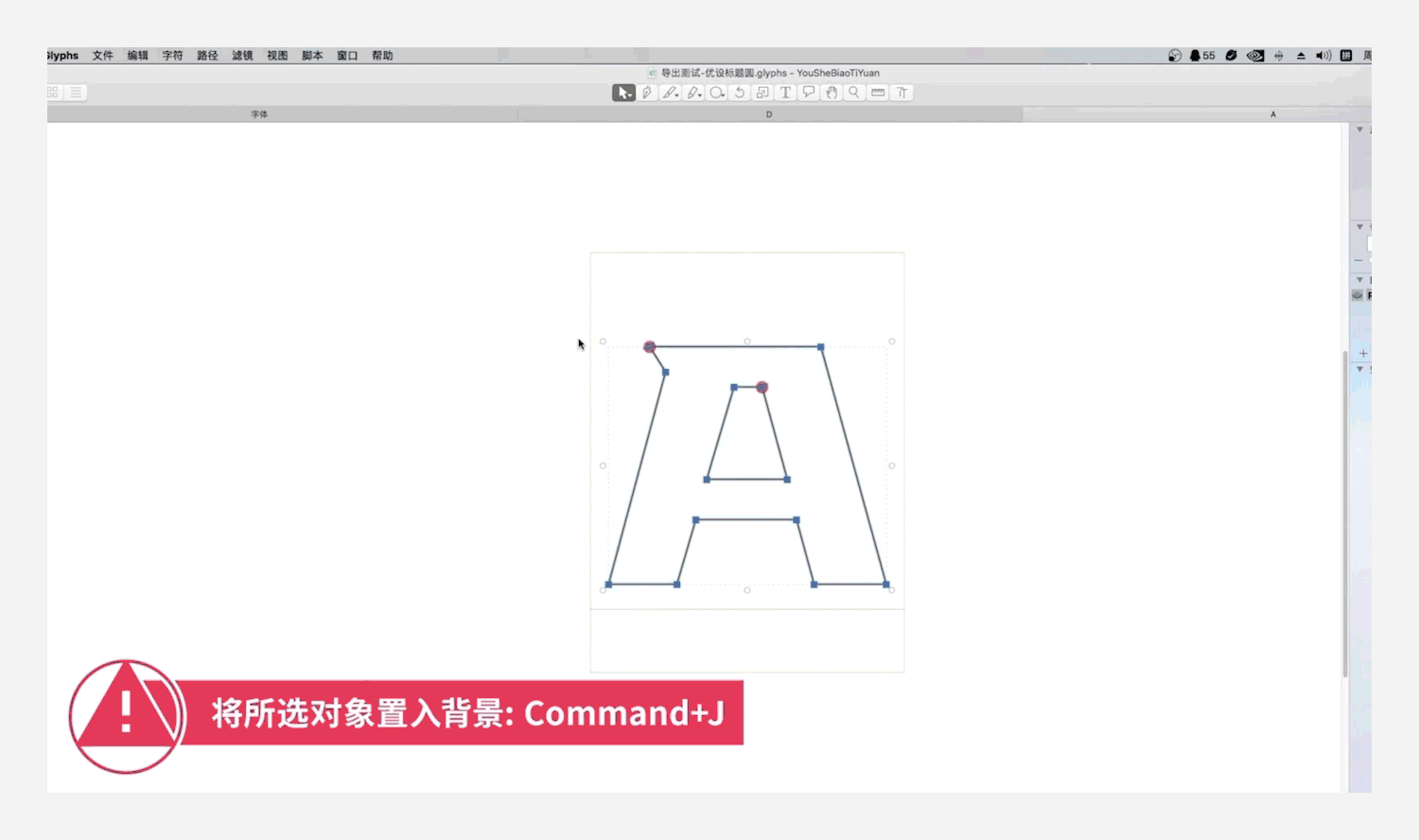 小帖士:撤销的快捷键是 ⌘ Cmd + Z ,但要注意,在 Glyphs 里,每个字符框都是独立记忆步骤的,在当前字符框内,是永远都不会撤销其他字符的操作。