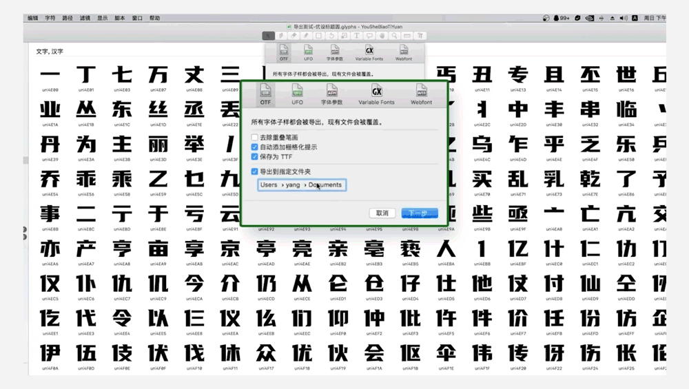 把字体信息设置好后,就可以导出字体啦!关于字体格式,我们通常会选择 OTF 或 TTF 文件格式。