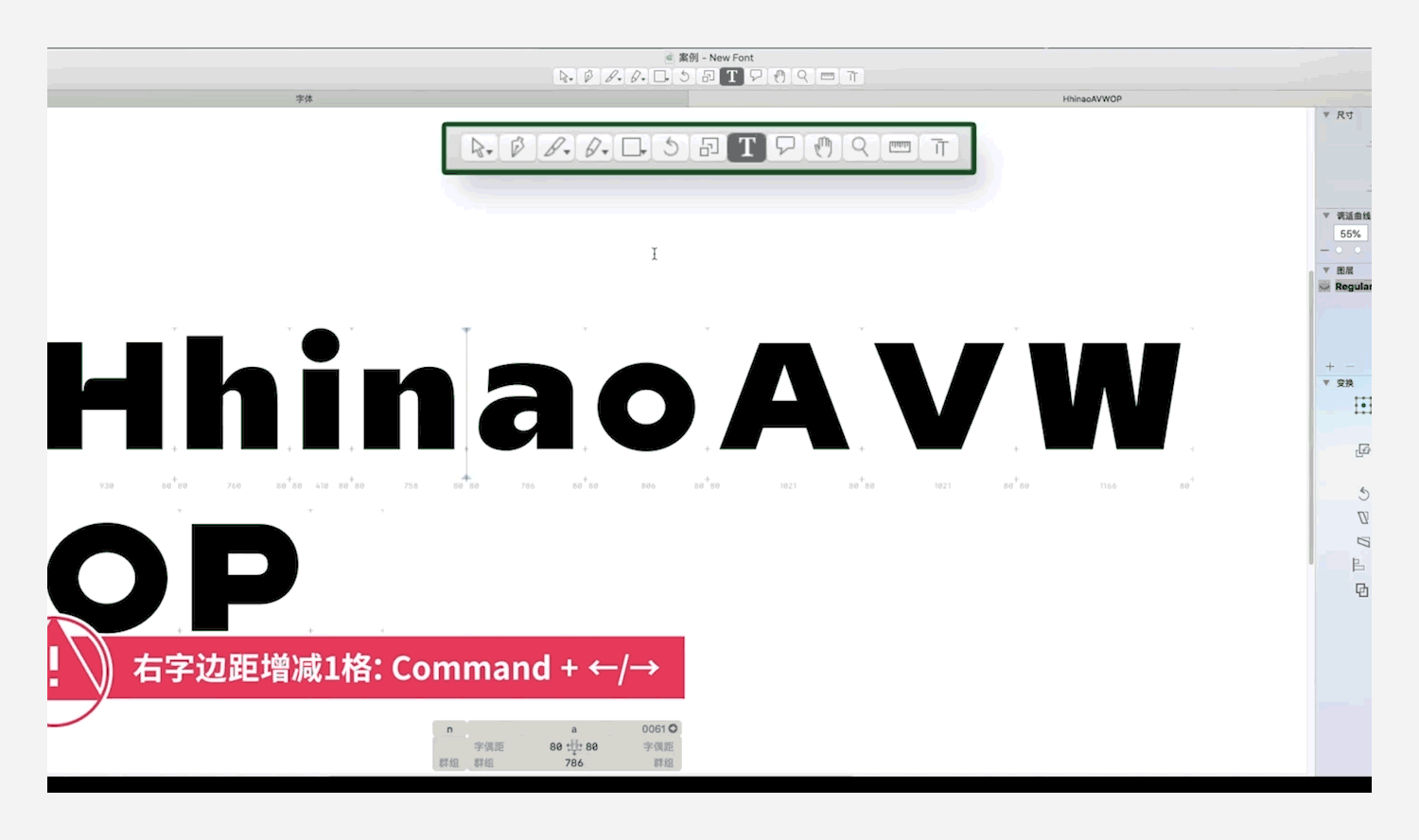 在我们设计好一套字体之后,就需要去整体的调整字母边距和字偶间距,这是非常重要的工作。如果不去做这些调整,那么在实际使用字体时,字间距在视觉上就会显得忽远忽近,留白也非常难看。