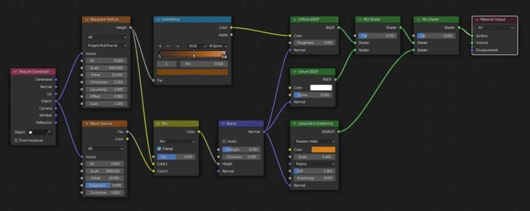 毛毡由两种类型的毛发粒子系统组成,并将它们叠加在基础的材质上。下面是基础材质节点图,主要是一个小比例的Musgrove纹理节点。