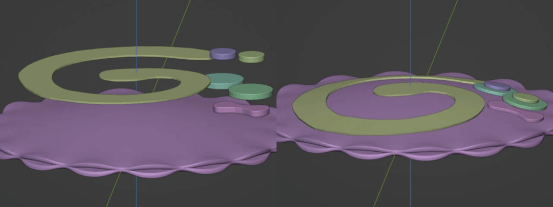 ▲ 在每一个贴花上都应用实体化修改器,可以从右图看到旋涡是如何贴合主体,通过使用Project(投影)模式将贴花沿着 Z 轴投射到主体上