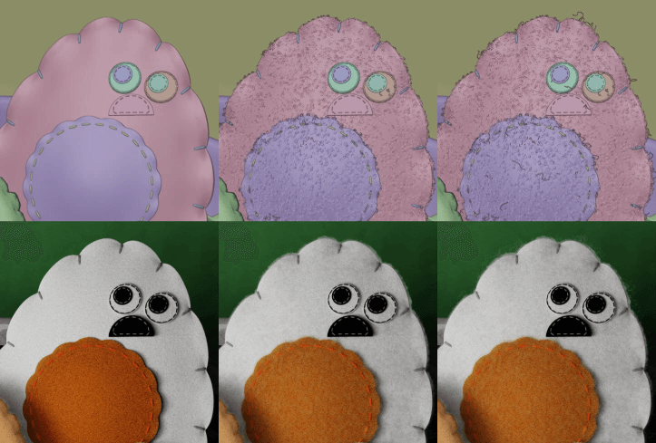 Michael:因为毛毡材质对渲染的效果至关重要,所以我找了很多毛毡材质方面的教程,但没有一个看起来是效果是比较完美的。最终,我花了一个下午的时间测试将几个不同制作方法结合起来的效果,终于找到了我想要的最完美的样子。