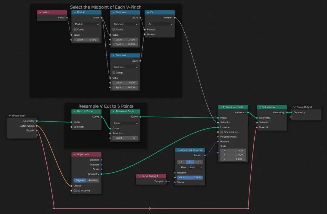 以下节点图将对每个「V」重新采样为5个顶点,然后在每个「V」的第2和第4个顶点上放置针迹。想要添加缝合线,我们需要在编辑模式下选择所有这些边,复制它们(Shift-D),并将它们分离到自己的对象中(P,分离选择),并将几何节点应用于新对象。