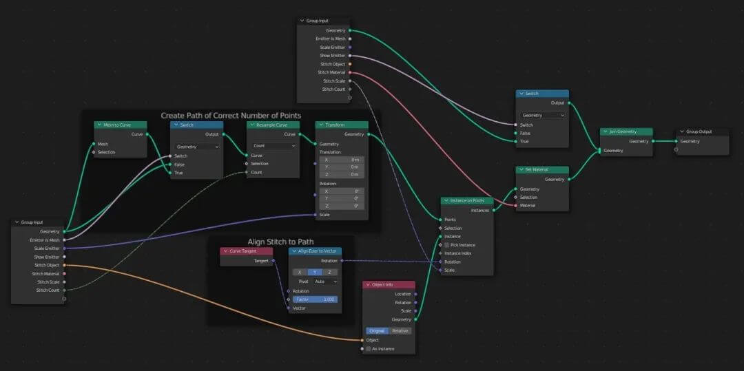 缝合线的添加方式有两种情况,不论何种方式,我都使用了几何节点。第一种情况是将它们沿着一条路径放置,例如围绕蛋黄、鱼饼的粉红色漩涡或眼睛和嘴巴。下图为两种情况的几何节点图的简化副本。