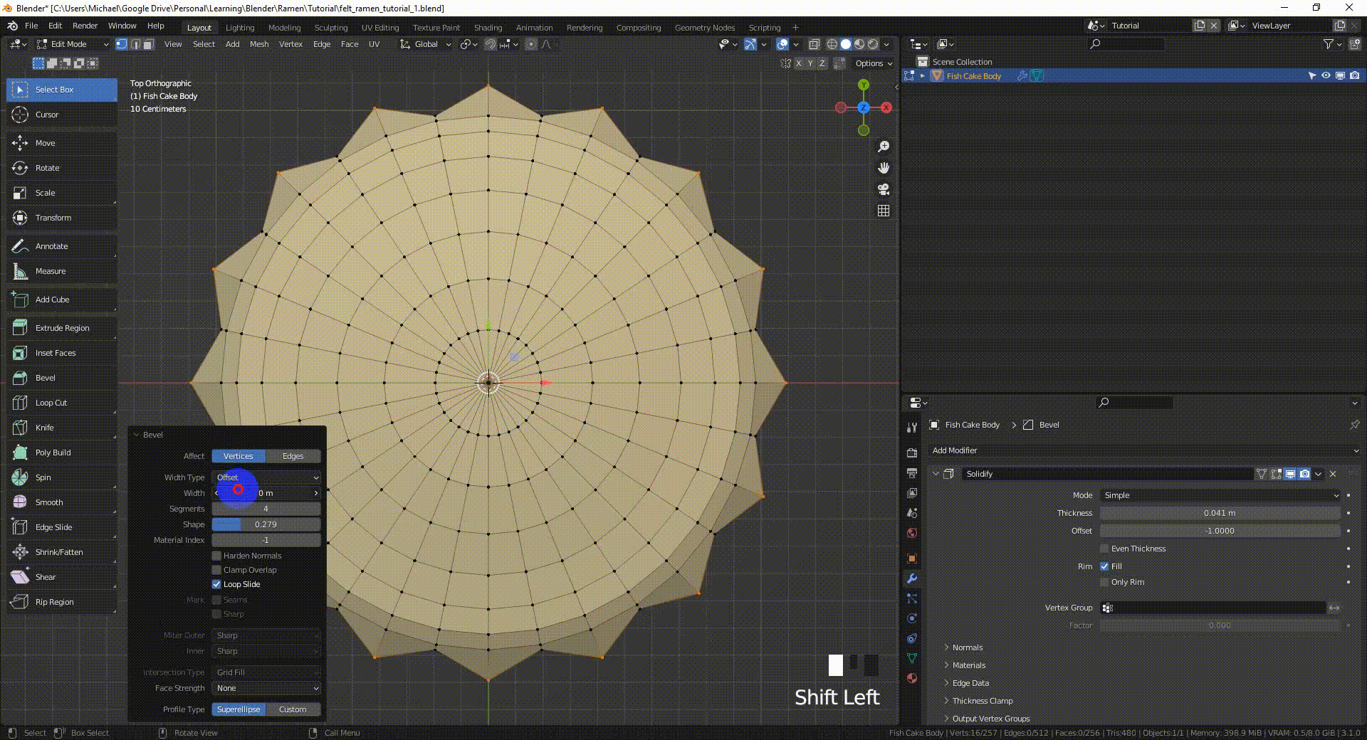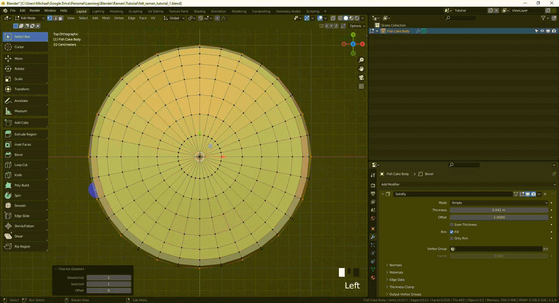 我在鱼糕和鸡蛋上创建了扇形的边缘,首先选择整个外边缘(Alt LMB),然后使用 Select(选择) → Checker Deselect(间隔式弃选),取消了对交替顶点的选择。最后,我缩放(S, Shift-Z)了被选中的顶点来创建点。为了设计扇形,我对顶点(而不是边缘)应用了斜面(Control-B)。