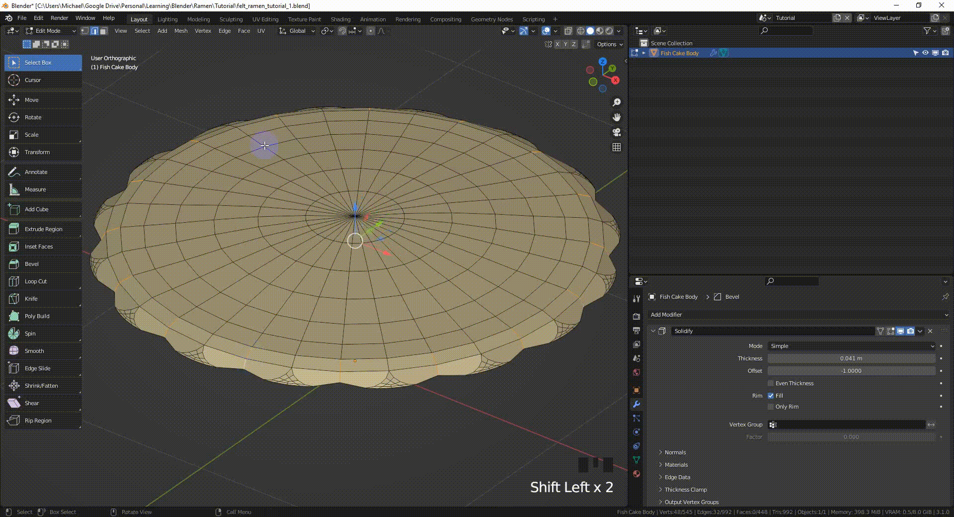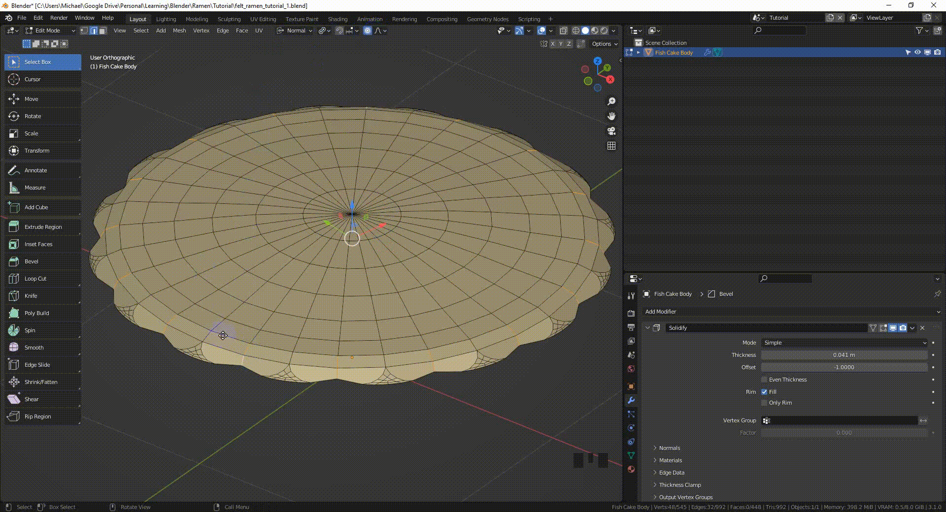 对于边缘轮廓比较圆滑,且需要呈现明显「夹捏感」的物体(比如鸡蛋和鱼饼),我选中他们的边缘,然后沿着他们法线的Z轴,稍微向下移动了这些边缘(G, Z),压痕的感觉就出来了。这时,重点是要将 transform orientation(变换坐标系)设为 normal(法线),将 transform pivot(变换轴心)变成 individual origins(各自的原点) 。另外,使用比例编辑(O)可以创造出一个更平滑、更自然的效果。