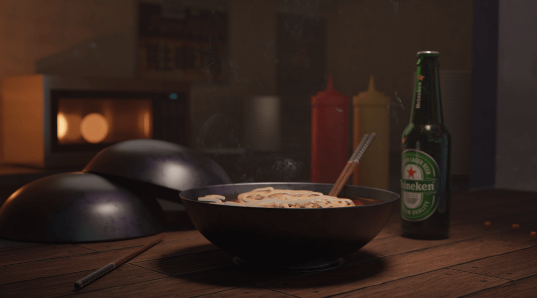 Michael:碗和筷子使用了简单的程序化材料(次表面散射让筷子看起来像有点半透明的塑料材质)。我制作了一些长条形的模型,然后把他们在碗里模拟成面条的样子,运行模拟后,还添加了布料修改器和细分曲面修改器。灯光则简单添加了几个点光源营造我想要的光影交错的效果,除此之外还添加了一个区域光来照亮场景合突出角色周围的细微绒毛。