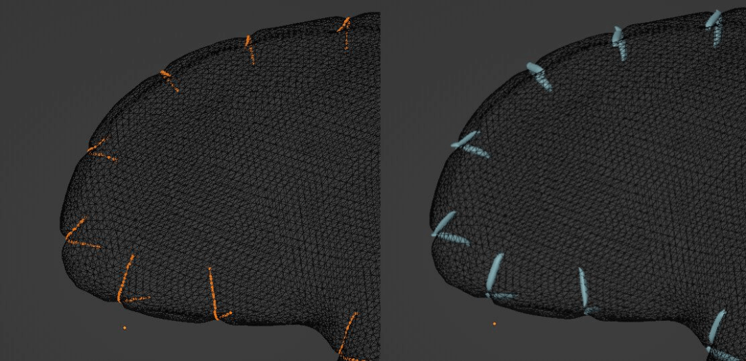 这个节点图可应用于曲线对象或任何简单的切口贴花,如眼睛或嘴巴(无需创建单独的曲线对象)。在后一种情况下,将参数「Emitter Is Mesh」和「Show Emitter」值设置为1,并使用「Scale Emitter」值从边缘稍微插入针脚。记得在几何节点之前添加一个shrinkwrap modifier(收缩包裹修改器),以便针迹与对象齐平并遵循表面的弧度。