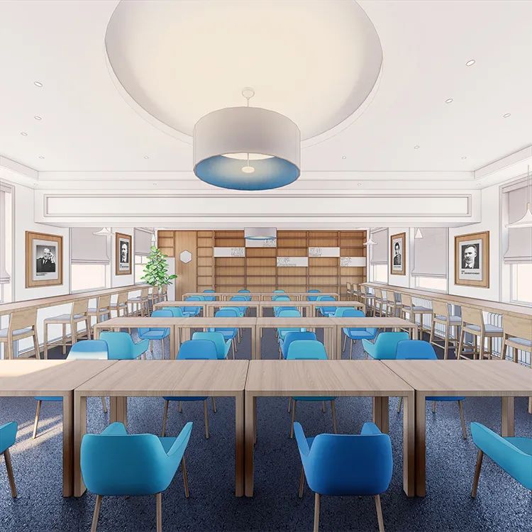 阅览室,是一个多功能空间。在这里,可以上课、讲座、沙龙、阅读、探索……这里是书山,也是学海,但是作路径、舟船的,不仅仅是勤奋刻苦,还有趣味和光彩。不同样式的桌椅,适合不同性格的孩子,他们可以在这里体验不同的阅读方式。空间中,点缀着盆栽植物、小兔子坐凳、名人画像……和书本一起,点亮着每一个孩子求知的心灵,让阅读的空间,成为知识的海洋。
