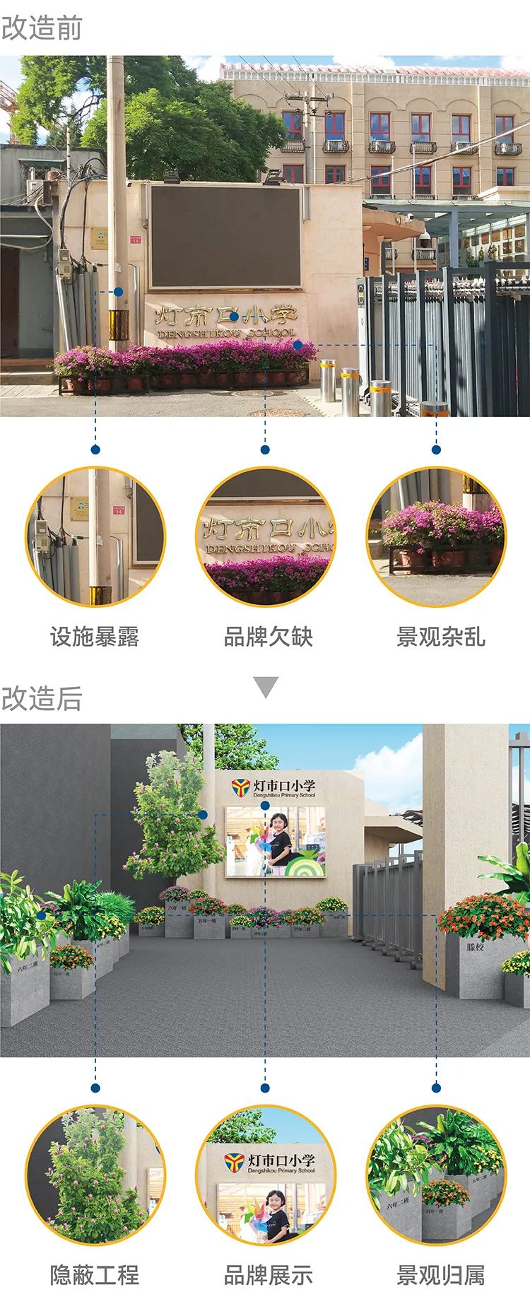 学校的文化环境建设,以“点亮”为题,以亮点为目,演绎环境对于人的影响。顺着胡同,向着学校前行,是学校的品牌标志,点亮了人们心中的期待;大门之前,摆放着很多花盆,每一个花盆都需要班级和学校的行政部门来认领,然后写上班级或部门的名字,点亮了校园之中每一个人的归属感;花盆之上的花朵,有如学校之中的孩子,在爱与关怀的点亮中不断绽放,不断成长为祖国的花朵;大门口的环境设计,还是一项隐蔽工程,把门口杂乱的电线、陈旧的巷弄隐藏在光彩之后,让环境由内而外地绽放。