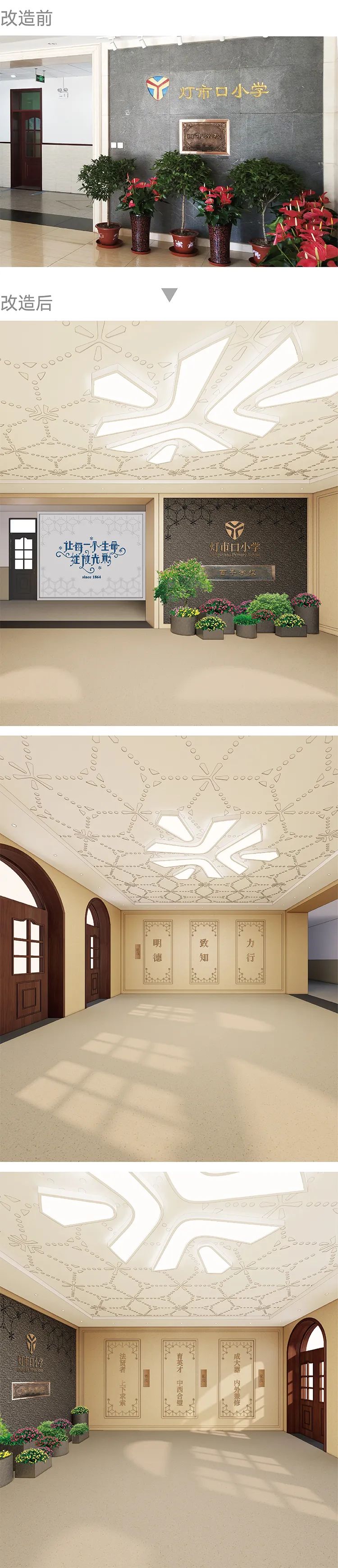 很多学校,在环境建设上已经投入了大量资源,如果文化重塑,是否要拆除重建?拆,造成资源浪费。不拆,重塑工作难以完成。而系统化的规划,可以让历史照进未来。灯小的大厅设计,保留了原有米黄色石材墙面,传承了学校带给人的温馨氛围,但是却用品牌经典纹样增加了细腻感、品质感和归属感。纹路的连接,是灯光与灯光的连接,精彩与精彩的连接,形成了亮的网络。