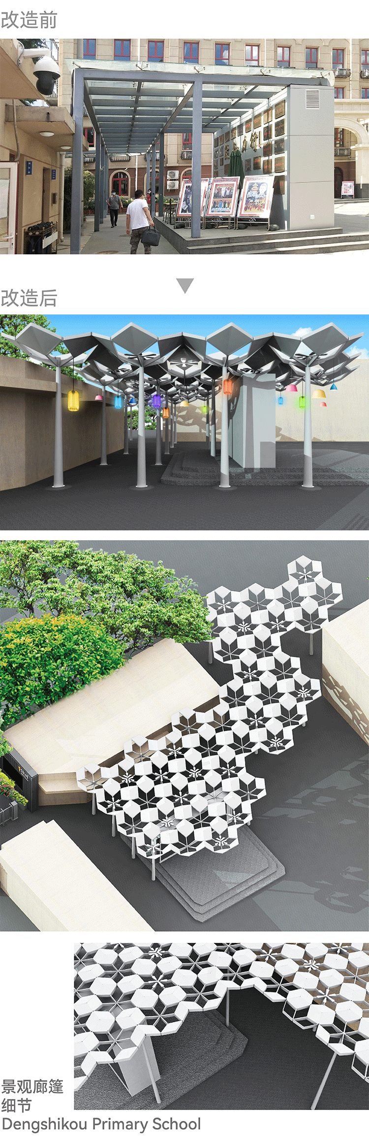 当每一个生命都绽放光彩,校园中人人一起灿烂。进入校园之中,是光与影、色与彩交织而成的景观廊篷。景观廊篷的造型,源自经典辅助图形纹样,有如一朵又一朵绽放的花朵,彼此连接,彼此成就,若花海、若树林。一片片花瓣,其上是透明光伏发电板,不遮挡阳光,却可以产生电能,点亮校园之中的灯光;其下是可变色灯光,哪怕四季更迭,也能光彩灿然。每当有活动之时,孩子们还可以将自己手工制作的个性之灯,悬挂在景观廊篷之上,让个性色彩能四季绽放。