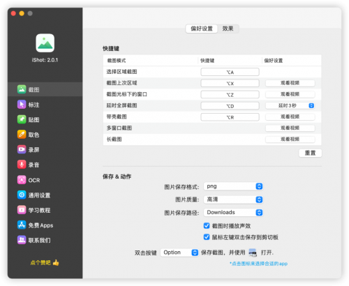 ③:延时全屏截图延时全屏截图,支持倒计时声音播放,用来截取不易选取的窗口。④:截图上一次截图区域使用快捷键,快速截图上一次框选截图的区域。⑤:截图光标下窗口使用快捷键,直接截图当前鼠标下的窗口,无需激活该窗口。⑥截图导圆角、阴影效果支持截图自动导圆角、截图阴影可进行颜色、大小调节,让你的截图更优雅。⑦截图快速打开完成截图后可通过双击Option,使用自定义的App打开图片,让你的截图、编辑无缝衔接。默认为使用“预览”打开图片,也可以设置为使用别的App打开;另外,当选择访达时,是打开截图保存的访达位置。⑧保存/存储