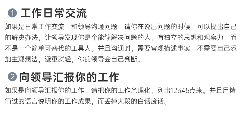 我们在与领导沟通时,领导们最怕下属说话半天说不到重点,没有条理性。汇报工作笼统,避重就轻或者只是把问题提出,自己完全没有想法。