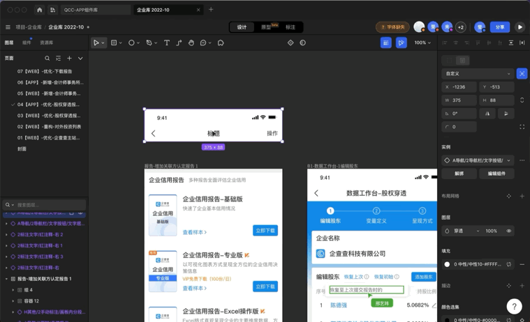 “在提升设计师工作效率方面,我特别要提一下 MasterGo 的团队库组件样式功能”,刘高正说,“企查查的 APP 和网页全部加起来有 3800 多个页面,假如有一个图标要修改,可能上千个页面都要手动调整,你可以想象这个巨大的工作量会带来的耗时有多少。但是我们在 MasterGo 里精细化制作了近 3000 多个组件,从字体到颜色,定义了一整套设计规范并沉淀在团队库中。团队成员不仅可以随时调用组件和样式,就像搭积木一样设计出一个精致规范的页面,并且可以实现在团队库中修改组件和样式后,自动同步修改好上千个页面中对应的图像,可以说设计的效率有一个疯狂的提升。”