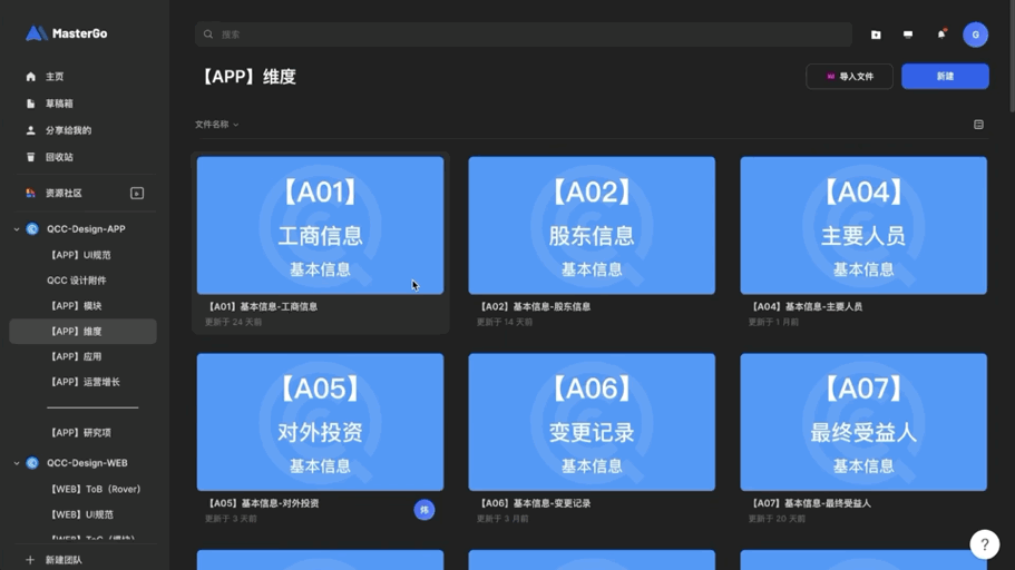可控性,是设计团队管理的关键要素,产品设计文件是一个数字产品公司最核心的资产。而对于设计文档的可控性管理,也是企查查设计团队负责人刘高正通过 MasterGo 解决的最大痛点:让所有的生产都在云端发生,生产的过程即归档的过程,这样既实现了设计资产的安全可控,也实现了设计工作的效率可控,可谓一箭双雕。